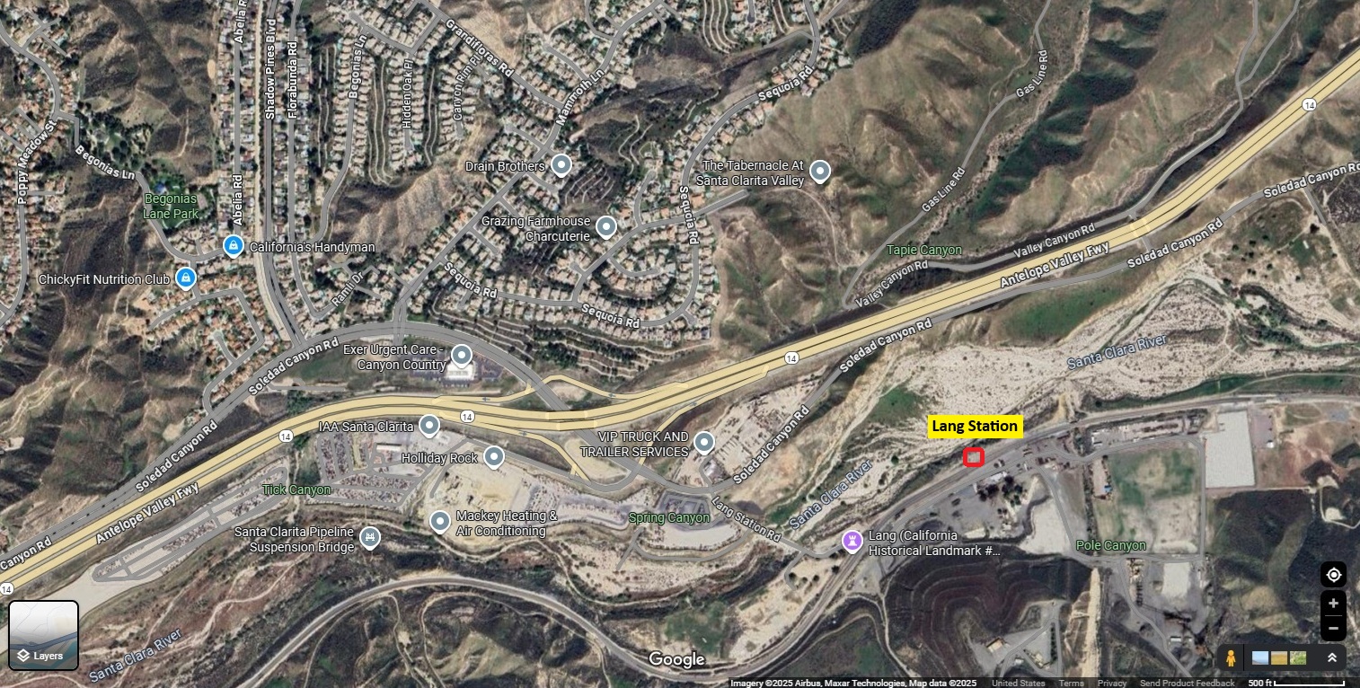 "The Western Union operator at Lang was driven from his office by the flames while telegraphing a message concerning the fire. The Southern Pacific re-established communication later, in a section house which the flames had passed by... After the destruction of the railroad property and the hotel owned by C.H. Clayton of Los Angeles, at Lang station yesterday, the flames driven by a strong north wind swept the ranch of Deputy Constable Youngblood, three miles away, consuming five small buildings and his olive orchard, then caught the undergrowth and oaks along the sides of Soledad canyon. The Southern Pacific railroad tracks were between two walls of fire for awhile and telegraph poles and wires went down."The San Bernardino County Sun of October 7 reported: "Lang station, owned by the Southern Pacific, was swept away almost immediately. The only building left to identify the station, which consisted of a hotel, depot, water tank, section gang house and handcar house, is the last named building."