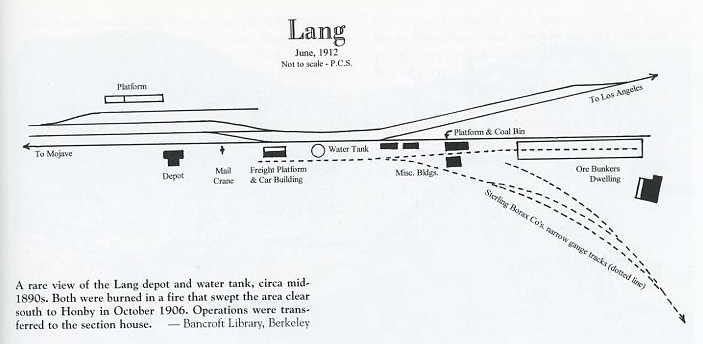 "Lang is a peculiar little station, a mere handful of railroad workers furnishing its only inhabitants. A water and a railroad siding are it chief adjuncts. At one time during the heyday of the Sterling Borax Company, a spur was built by the latter and joined the S.P. at Lang, where it was made a shipping point for both the crude and more refined ore. Nestled in the hills with trees and water near by, it presents a picture little indicating in its loneliness, and seclusion, that some day it would be aroused from a state of lethargy by thousands of visitors, with all the pomp of statesmen, to witness and celebrate the occasion when the last spike was driven in the great railroad that passes through the tiny hamlet. People living in the vicinity scarcely realize the day's significance, and wonder if their children will be present at the diamond jubilee. So on Sunday, September 5th, Lang will blossom and radiate a welcome to its guests as it has never done before. WELCOME!"There were many newspaper stories of the event including this one from the Los Angeles Daily Illustrated News of September 6 (Part 1, Part 2).