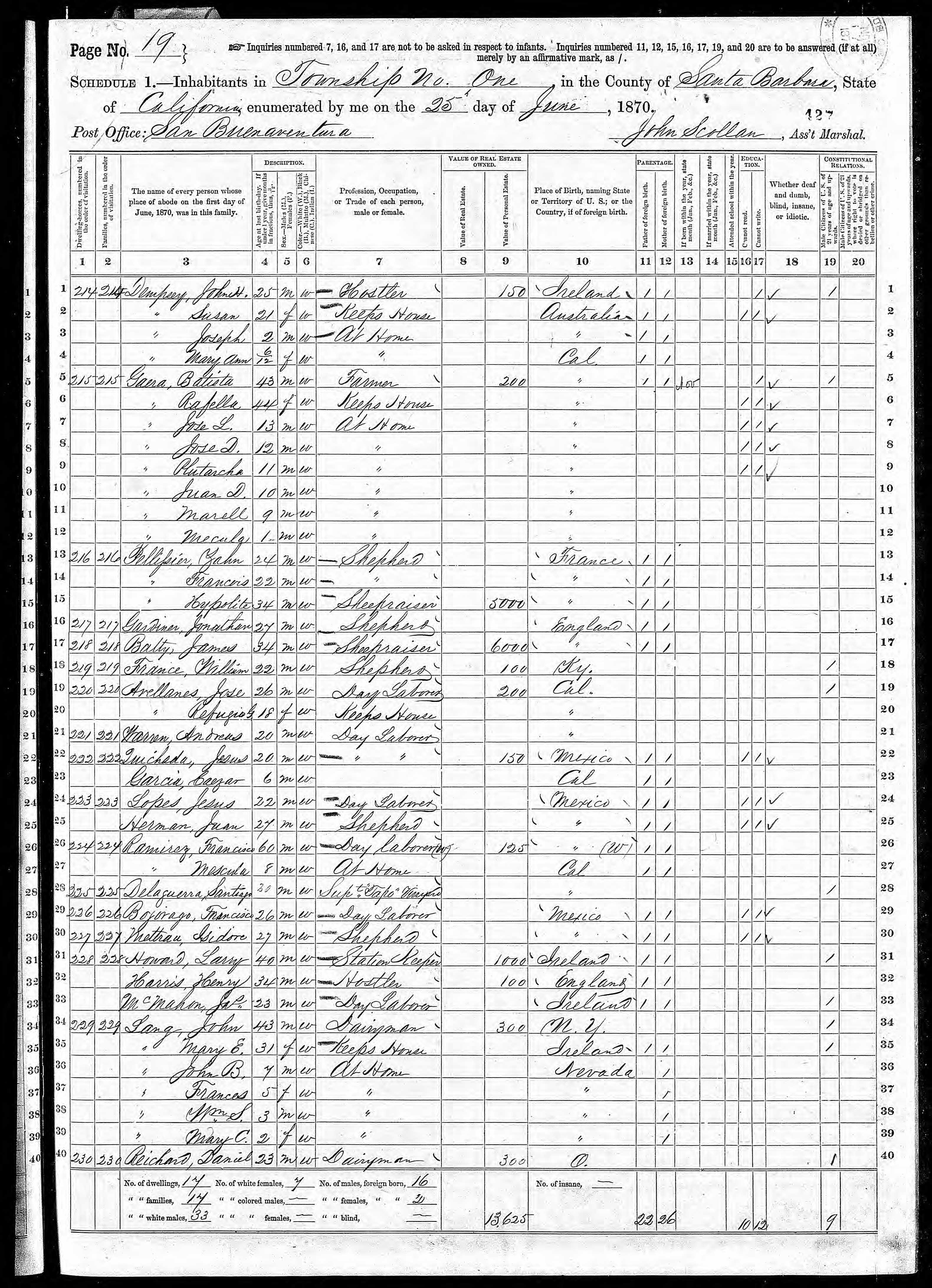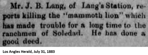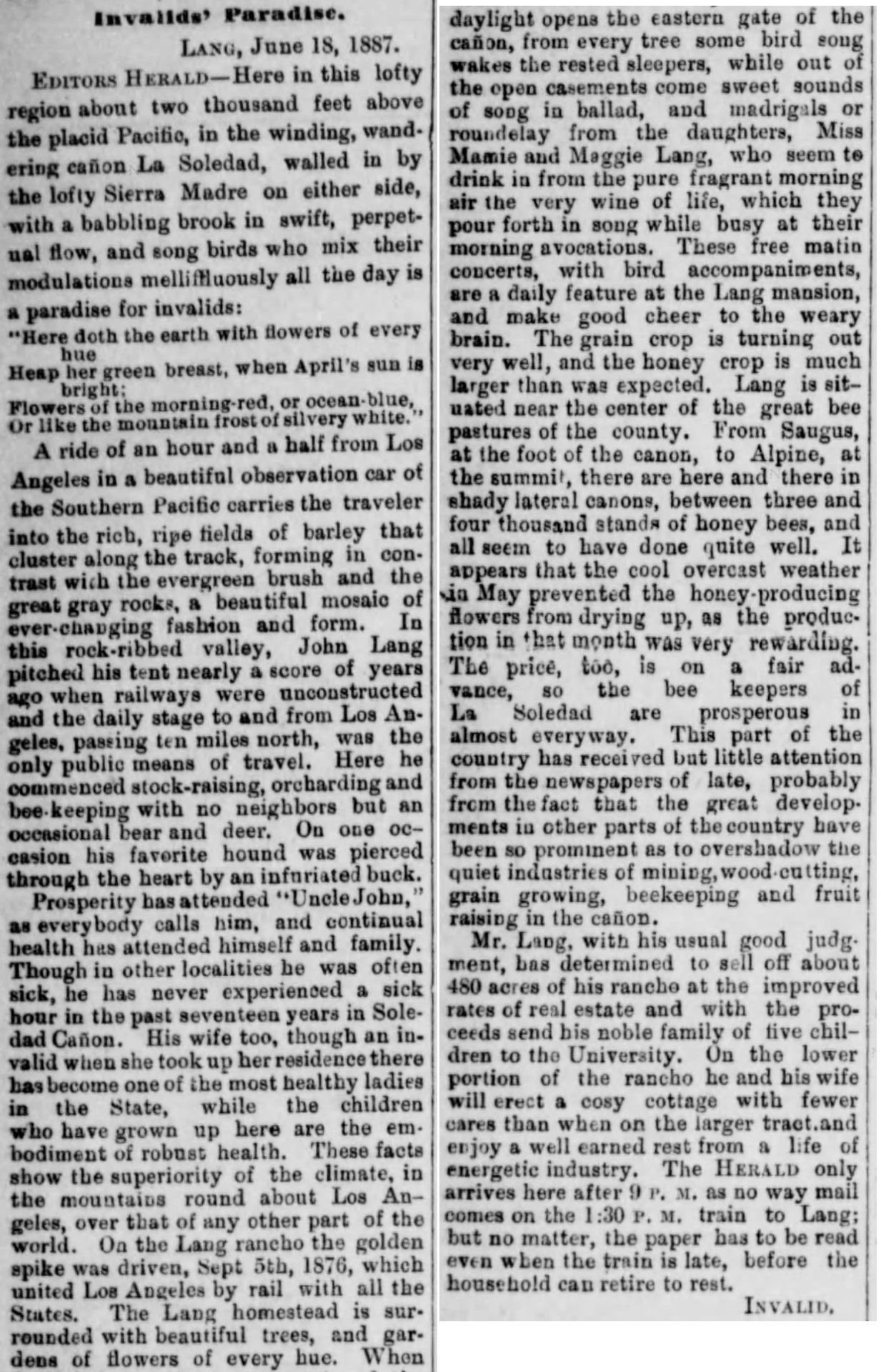 Lang is situated in the Soledad Canon, deep in the beautiful recesses of the Sierra Madre, the charming empress of all mountain-chains. The canon was named Soledad (solitary) long before the language of Milton and Shakespeare was spoken in its lonely wilds, when deer, lions, wolves, and bears made this their chosen home...This passage through the mountains resounds to the roar of fifty trains of cars per day of the Southern Pacific system, that wind through its echoing rocks with persons and property for all parts of the earth, and under the greenwood shade sits John Lang and the wife of his youth and old age, breathing the odors of myriads of flowers and trees gathered from all parts of the United States.