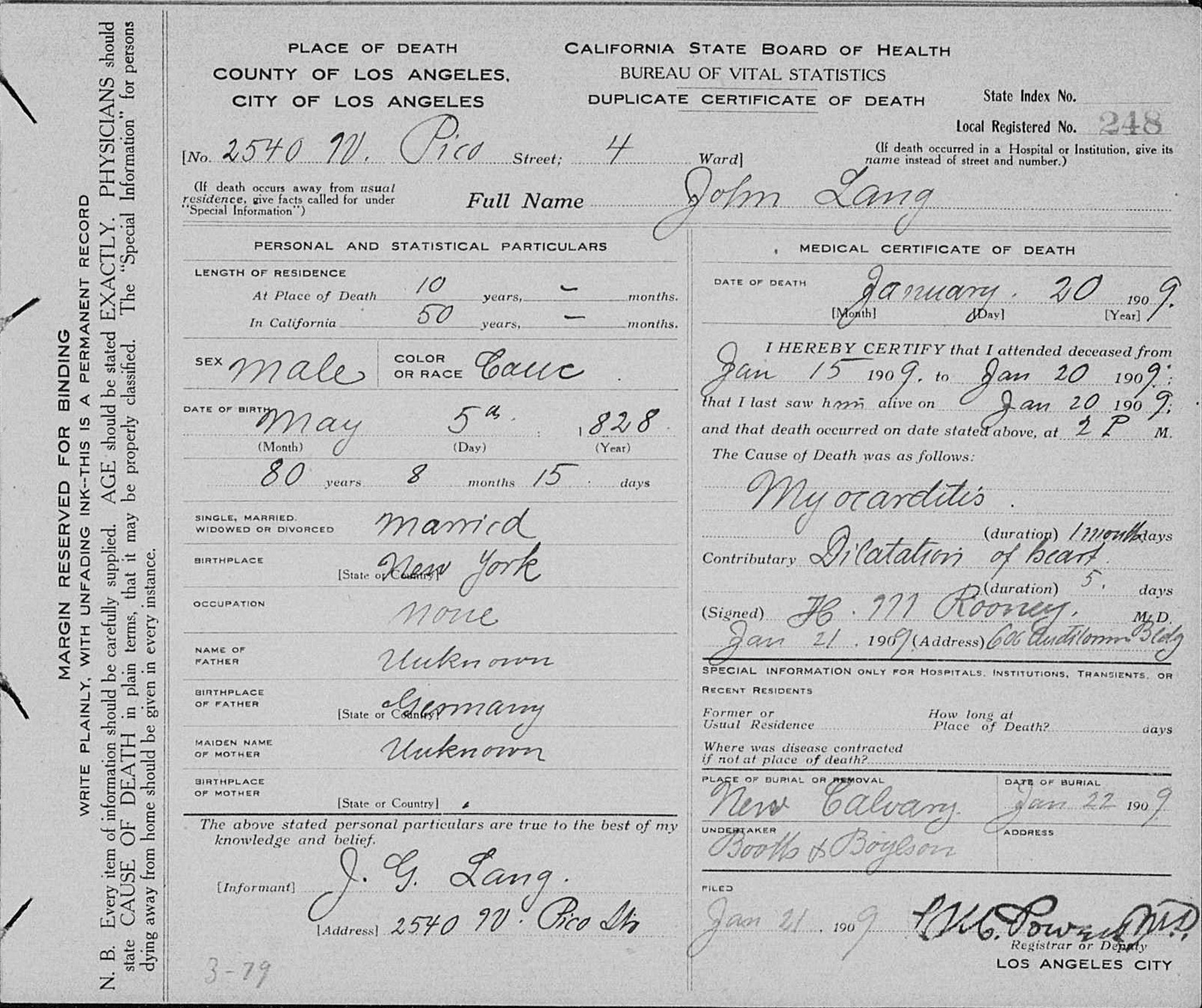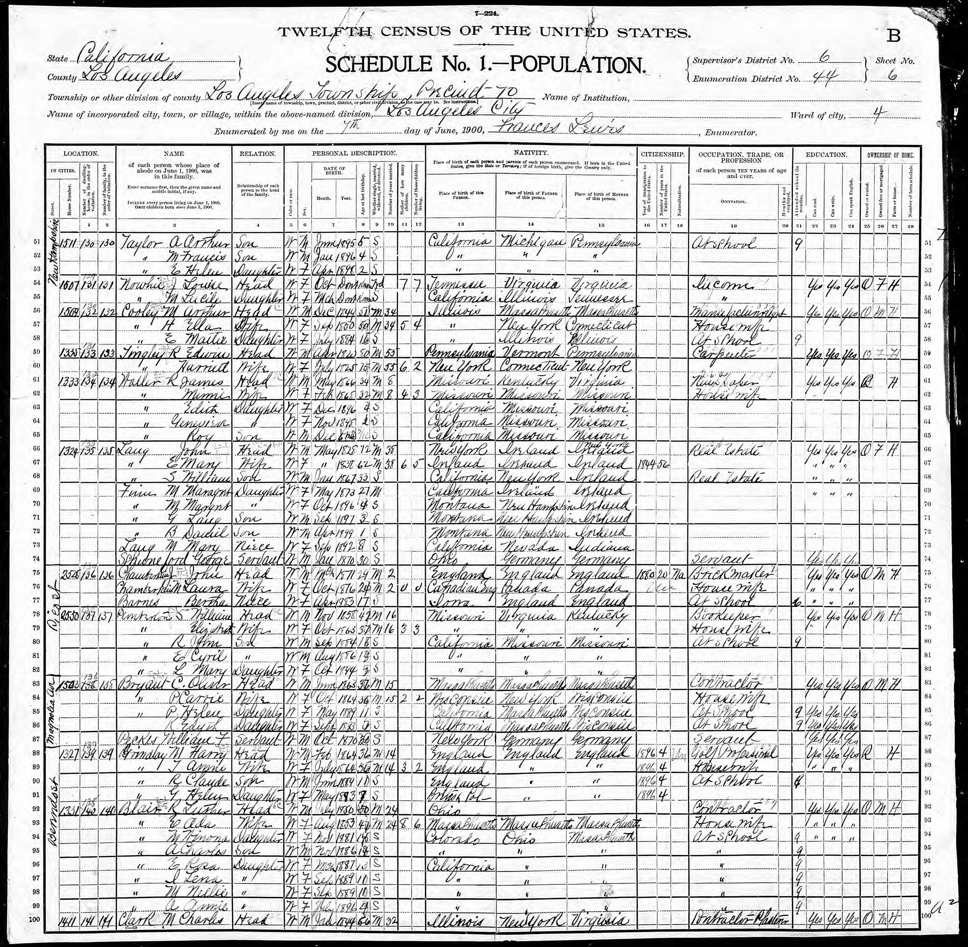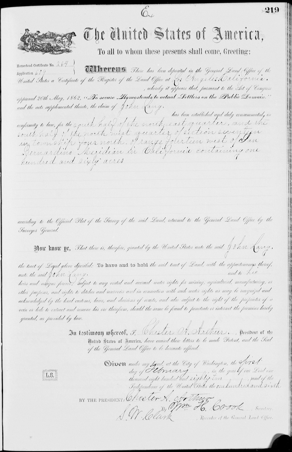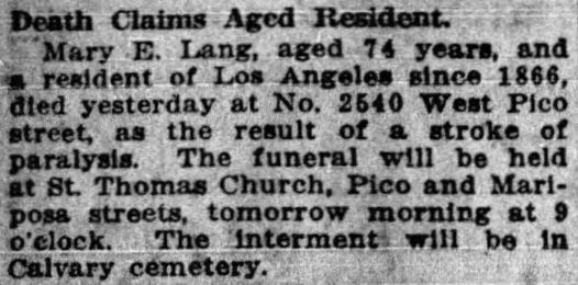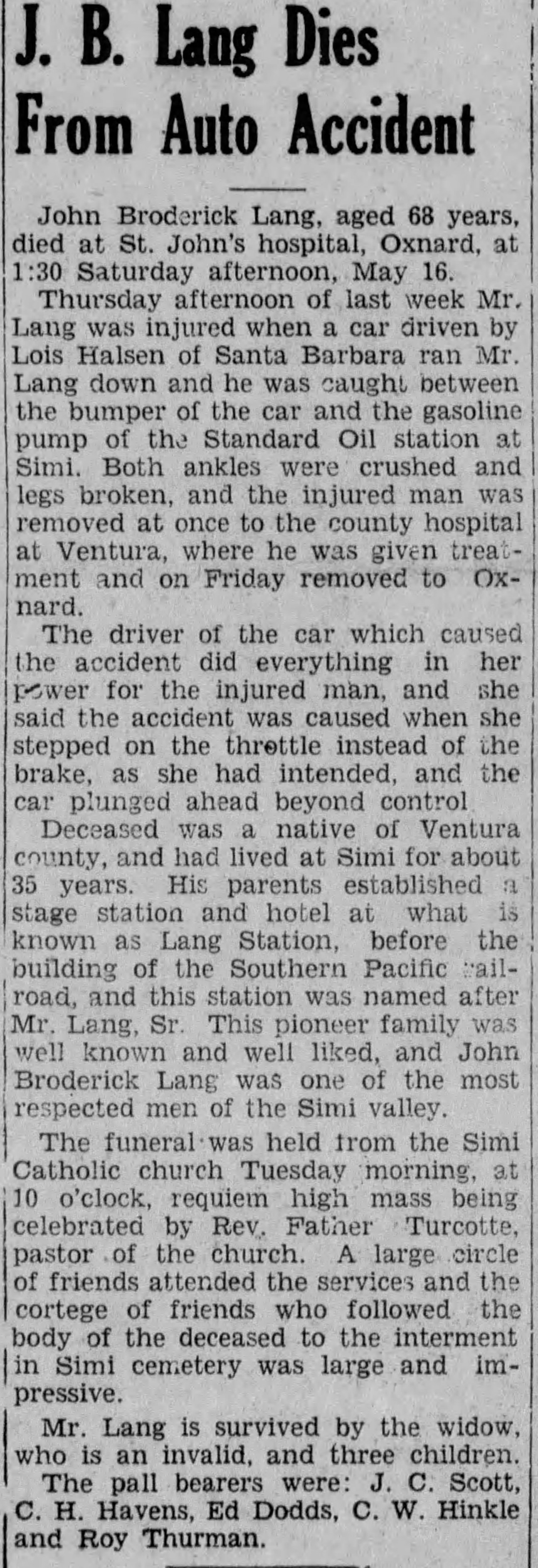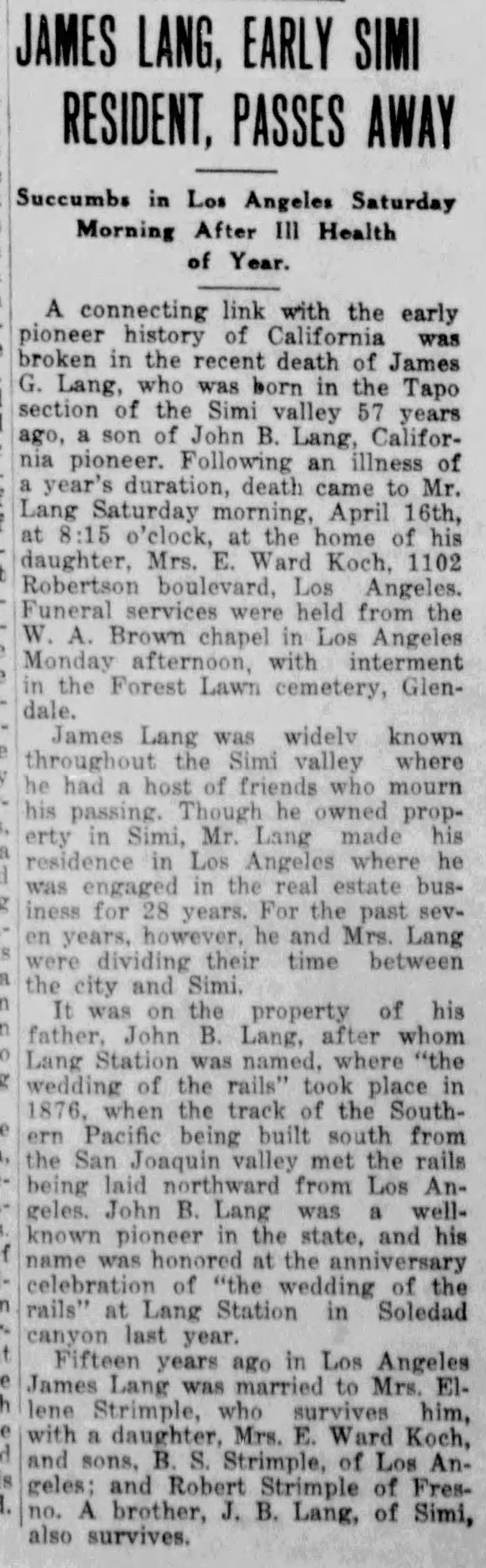 "was formulated by C.H. Clayton, of Lang, Los Angeles county, Cal., who is a regular correspondent of the P.B.J, a township justice, postmaster, and a successful manager of a few hundred stands of bees. Mr. Clayton's Senate Bill 135, was introduced by Representative Simpson, and was passed and approved by Governor Budd February 23d. This bill makes a misdemeanor of the adulteration of honey, punishable by a fine or not less than $25, nor more than $400, or imprisonment of from twenty-five to six months in the county jail, or both fine and imprisonment."1900 was an end-of-era year for Lang's Station. In January, the last Lang left the area. On January 17, 1900, John Broderick Lang sold his homestead, which he had just received a patent for two years earlier, for $540.65 to E.A. Miller of the firm of Miller & Herriott, Los Angeles real estate and loan agents.[59] J.B. and his family then moved to Simi Valley. They were listed on the 1900 US Census (taken in June) for the Simi Township.