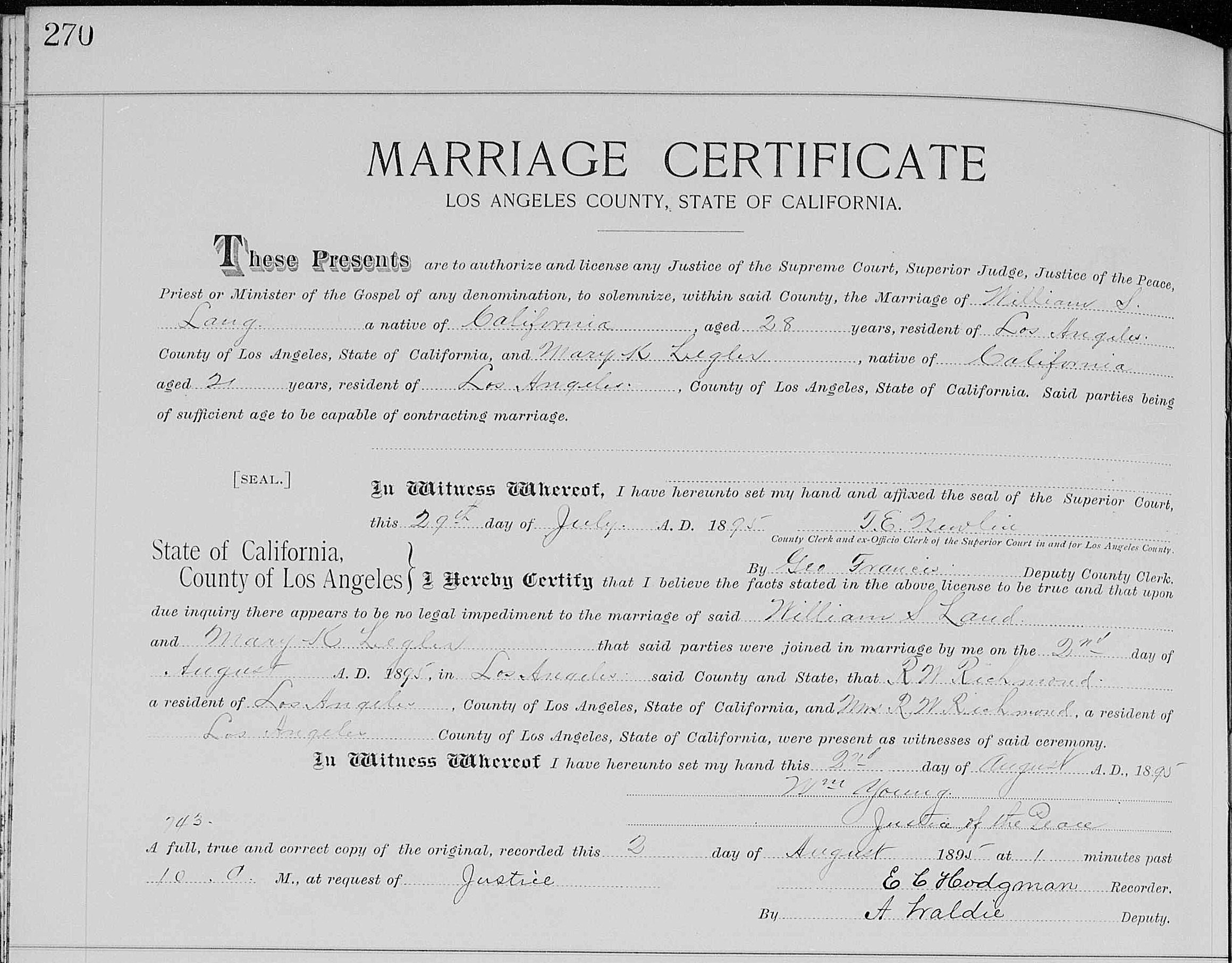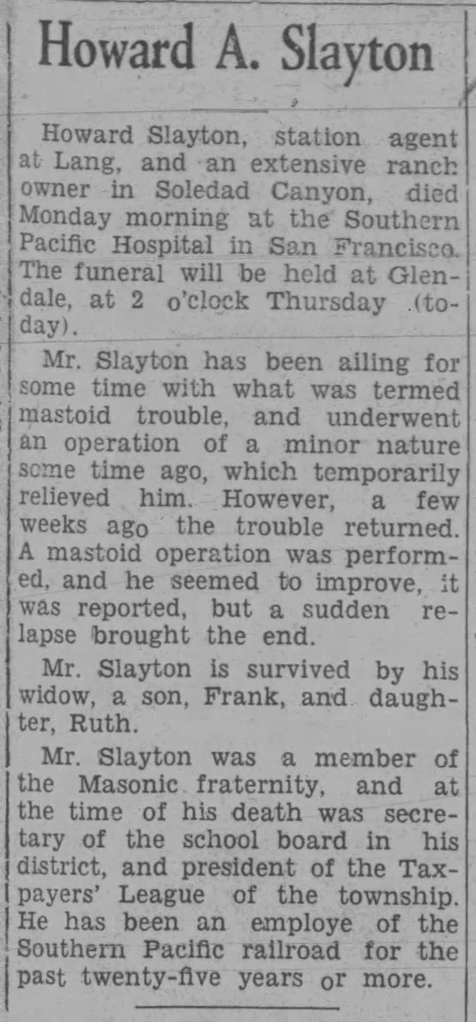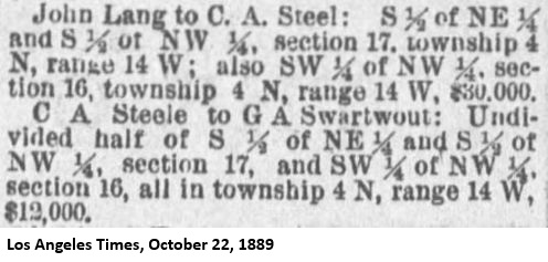 "Mr. John Lang, of Lang Station, Southern Pacific railroad, has sold his old home, where he has lived for the last twenty years, for the sum of $30,000 [yes, $30,000] - a most lovely place, at an altitude of 2,000 feet, no fogs, pure water as the earth affords, and the finest pure white sulphur springs ever known. Mr. Lang can relate some of the most remarkable cures effected at these springs that history ever recorded. The world probably affords no healthier spot. All diseases of the human family here find a remedy. Having lived for twenty-five years near these springs, I know what I am saying, and I have no interest in any way in the property, but only desire to do what good I can for the world while a little time is left me. The property has been purchased by Mr. C.A. Steele, of Los Angeles city, a gentleman of high order. A hotel, railroad offices, express, postoffice, schools, etc., are here. While Mr. Lang kept the house open for business he was thronged, the house not being one-fourth large enough.The transaction was recorded on September 16, 1889.[47] On that same day, Steele sold half interest in the property to George A. Swartwout (1850-1929) for $12,000.[48]