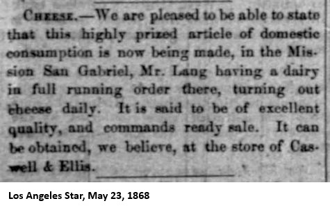 "At Lang's Station some two hundred acres are under cultivation, planted in barley, corn, fruit and vegetables, which produce the most wonderful crops. A late visit to Mr. Lang's orchard of a thousand trees, found his apple, peach, pear, quince, apricot and prune trees loaded down with fruits, until the trees had to be propped up to deep the limbs from breaking down. His fruits are of the choicest varieties and bring a big price at the ranch. His figs, nectarines, olive and walnut trees were also very fine, while the whole orchrd as well as his vines are entirely free from insects, smut or other drawbacks, to be found in lower altitudes. In his gardens can be found the choicest crisp vegetables to be found in the country, growing the year round. Cabbage, celery, carrots, chickory, corn, lettuce, potatoes, turnips, radishes, rutabegas, melons, strawberries every month in the year, as well as many other vegetables usually raised in this climate.That was quite a rosy picture painted. It is hard to believe that everything said there was true (1000 trees?), but there is no doubt that John Lang was doing well there, rain or no rain. Also, John Lang was a dairyman, so there were probably cows somewhere on his property. He was well known for his cheese making abilities.