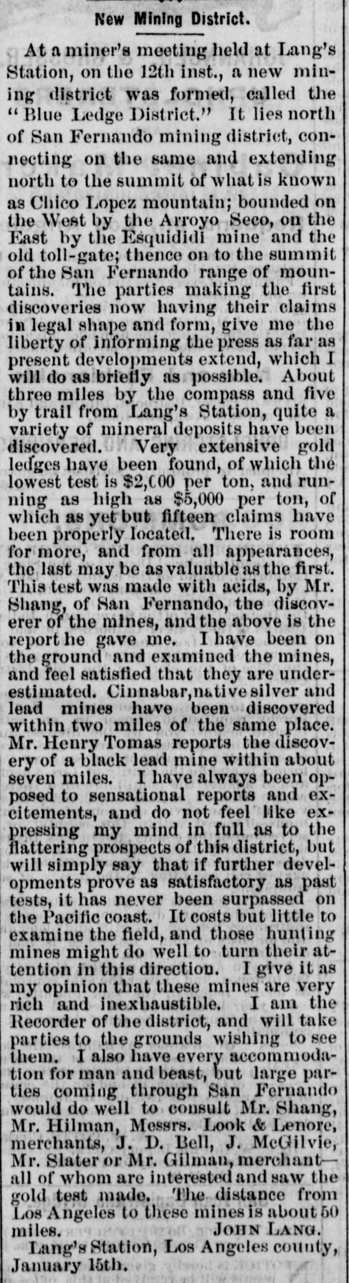 "All minerals exist in this section. Gold, silver, iron, copper, lead and traces of coal are found in almost every direction from Lang Station. I am recorder of this mining district [Blue Ledge District], and have been for twelve years. I have many claims on record that belong to parties too poor to do anything with them. All that is needed in this district is mining men with money who will develop the mines, and not weaken if they fail to find a Comstock in five or ten feet. A man located four gold claims here only ten days ago, top rock in all assaying from $21.54 upwards, but he can't work them, having no means like the rest and all the ledges are from four to seven feet wide. Silver mines up here are in the hands of men similarly situated. Gold can be found in most any pan or shovelful of dirt in this vicinity. The time is near at hand that many a bonanza will be opened up right in this section. Capital is looking into this matter of late, and any capitalist, not a tenderfoot afraid to chance a dollar, will find his fortune buried in the earth."In July, a bed of building stone quality red sandstone was found near Lang's Station. It was "examined by experts and pronounced the finest building stone yet found in Southern California. The new quarry is the property of John Lang, who is now taking steps to have it developed."[41] A month later, Lang said that the quarry "has been leased to a heavy Los Angeles company for a term of 10 years. They have six or eight teams on the ground making first-class roads for very heavy work. Every one that has seen the rock likes it. Bidders are coming in already thick and fast."[42] Lang also reported on a very large deposit of kaolin (soft white clay that is an essential ingredient in the manufacture of china and porcelain and is widely used in the making of paper, rubber, paint, and many other products.) found near by. It was, of course, "pronounced by experts to be better than China kaolin." The deposit "is on the side of a mountain, is about 15 feet wide and has the appearance of being extensive."[43]