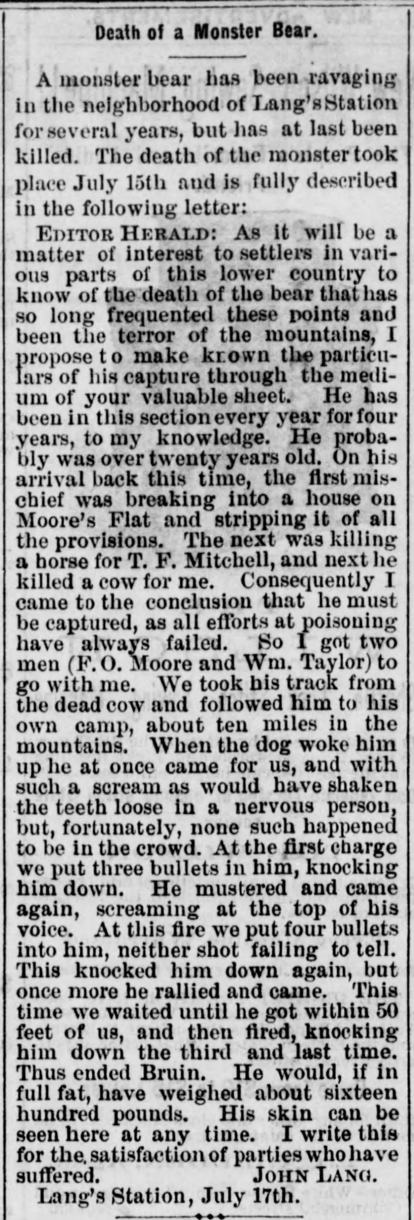Lang's is destined to be a great resort, as the mountains and valleys afford plenty of game and the place is so easy of access from any direction rail. The railroad company has put up a sixty thousand gallon tank and have put a ticket office at this point. A postoffice, telegraph and express office have been established here and the people are now petitioning the Board of Supervisors to open or establish an election precinct at this place [which was done September 2]. Mr. Lang now has some ninety regular boarders [probably some in the hotel and many more camped nearby] from among the mechanics and railroad men who are engaged on the great improvement being made by the railroad company in the canyon, which we will describe in another item tomorrow. The scenery at Lang's and along up the canyon above is picturesque and grand."