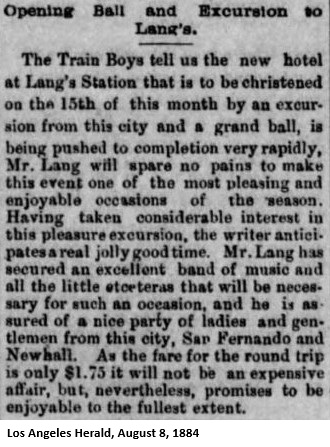 "We learn from a gentleman who came over the route last Saturday that of the 100 or more miles of railroad between Mojave and Los Angeles, not 10 miles was left intact by the storm of two weeks ago. This gentleman boarded the construction train and was forced to walk from Ravena to Lang, about 9 miles. The San Fernando Tunnel, he says, is not damaged but the approaches from both ends caved in."The Los Angeles Herald of March 14, 1884, reported that "The work in the Soledad canyon is going ahead by the aid of 1,000 men, and if no more rainstorms sweep away the new work, will be open early next week." In the midst of the rain situation, John Lang decided that it was time to build his hotel. The Los Angeles Herald of April, 10, 1884, reports that: