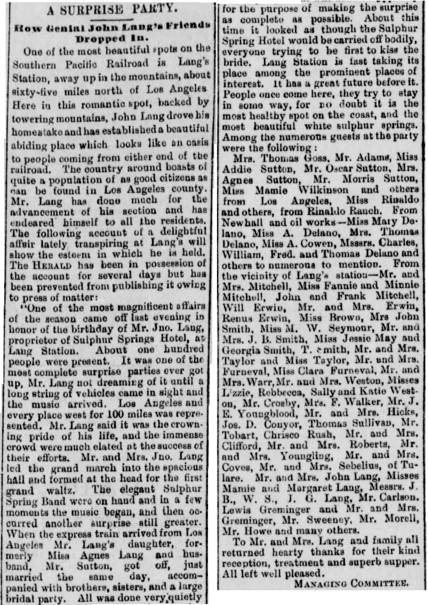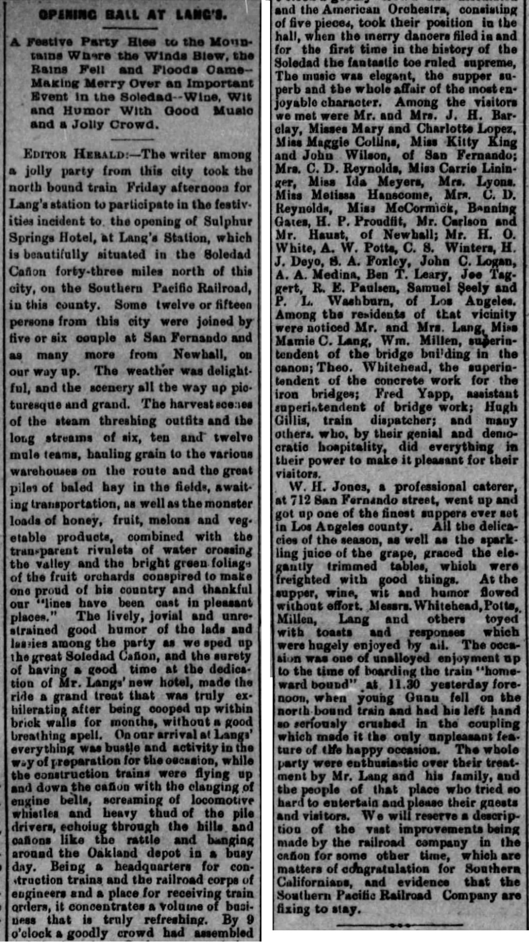 "My hotel at the present writing is surrounded with every kind of flowers, and roses that can be seen in full blossom. Also tomatoes and everything else are as fresh as in May. Altitude, 1820 feet. My bath rooms will be completely fixed up during the next month. Pipes will be laid to bring sulphur water to the hotel, and warm and cold baths will be in order in fine style. This will be a mountain health resort for tourist parties who can get around and help themselves. Nothing of a hospital nature will be allowed or practiced. Plenty of fine hunting grounds, horses, carriages, saddles, etc., on hand, and all kinds of fruits grown here at the Springs. Everything here that makes life pleasant. Extensive olive groves are being planted here this season. The intention is to make this the attractive resort of the coast. We know positively our springs are superior to anything in the line of sulphur water on this coast, and, as for climate, I can say, after sixteen years residence right here [since 1870], I have never known its equal. Many healthy people are traveling the world today who thank Lang's Station for it. Here is a school, post-office, ticket, express and telegraph office; excursion tickets on sale. Everything has been arranged to suit the convenience of all. Hotel kept on first-class principles. Charges reasonable. Very truly, John Lang, Proprietor. January 17, 1886."Meanwhile, the railroad was again suffering due to the rainy weather. The Herald of January 21, 1886: "The lines to San Francisco are all down, the whole railway and telegraph equipment from Lang's Station to Ravena having been demolished for the time being. It is estimated by the Southern Pacific Railway officials that it will be fully three weeks before the rails will be in working order to points north of Newhall. Yesterday Wells, Fargo & Co. began shipping their mail and packages to San Francisco by steamer." Los Angeles Times of January 21: "From Lang north to second crossing of creek the condition is as follows: One mile north of Lang 900 feet washed out 10 feet deep. A quarter of a mile north of this 700 feet are washed out 12 feet deep - rails and ties gone. Ninety feet of 8-foot fill at south of seventh crossing gone." Herald of January 23: "Above Lang's Station the $100,000 iron bridge is a complete wreck, part of it being carried upwards of twenty yards down stream. The wooden bridge is also wrecked, and the immense stone work made after the flood of two years ago was carried off like sand. The track in ten or twelve places is wrecked for varying from 20 to 150 yards." Finally, on January 29, the Times reported that "after the tedious ten days' blockade of railroad communication with the north, the siege is at last raised. At 4:30 p.m. yesterday the first train from the north since Monday, January 18th, pulled into the Los Angeles depot, bringing a lot of passengers, but no mail except 'pick-ups.'"