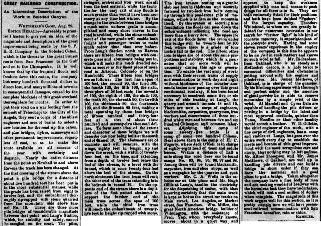 "a wonderful work of destruction had there been wrought [in Soledad Canyon] by the great freshets [floods of a river from heavy rain]. In some places both the wagon road and the railroad had been carried away, and in place of the two roadbeds a channel ten feet deep was left in place of the roads that were. A temporary track for the railway has been laid, in some cases in the channel made by the flood, while 200 men are hard at work in making a solid and substantial track at an elevation of about ten feet above the grade of the old track, where it will be out of the way of the stream which caused such great destruction. The worst damage was caused between Ravena and Lang's Station, where the ruin was complete. This track has been temporarily re-built twice, and now the third time it will be re-built in a very expensive and substantial manner, as rapidly as men and money can do it."The Herald on June 14, stated that "the track has been injured between Lang's Station and Newhall, so that the northern train did not arrive yesterday, but a large force of men is at work and it is expected that the track will be repaired so that trains will be on time tomorrow."