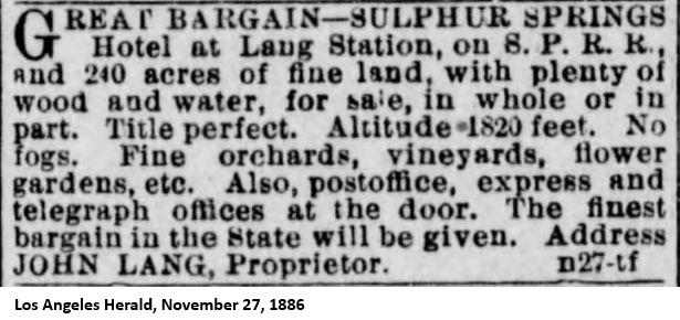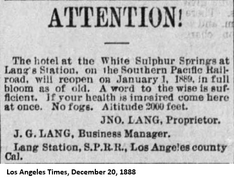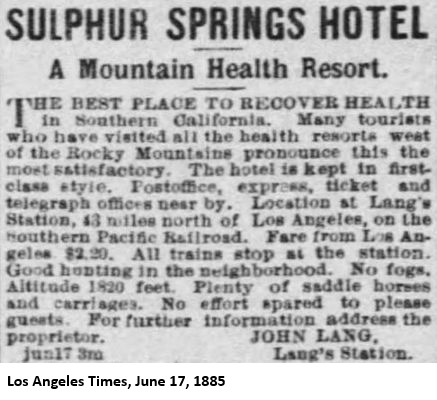"On a recent visit to Lang's, about 40 miles north of Los Angeles, I was driven over to see a magnificent, inexhaustible ledge of gypsum. Here, said I, is an opportunity of establishing plaster-of-paris works. I inquired of the owner, Mr. Lang, if he would be willing to assist in establishing such a manufacture, and he immediately expressed his hearty concurrence in the scheme. The present is a good opportunity to engage in a profitable enterprise, where the capital outlay will be very small, and the process itself extremely simple. Mr. Lang will be very glad, I am sure, to show any capitalist or would-be investor the ledge. The present supply comes, I am informed, from New York round Cape Horn; so, surely, there must be a large margin of profit."As far as I can tell, this business was never started. The Los Angeles Times of December 5, 1885, reported that "John Lang, proprietor of the Sulphur Springs, is about to put hot and cold water baths in his hotel." The Los Angeles Herald of December 11, said that "John Lang is in the city to make preparations for bringing the water from his sulphur springs to his hotel at Lang's Station. He yesterday contracted for 5000 feet of water pipe for this object."