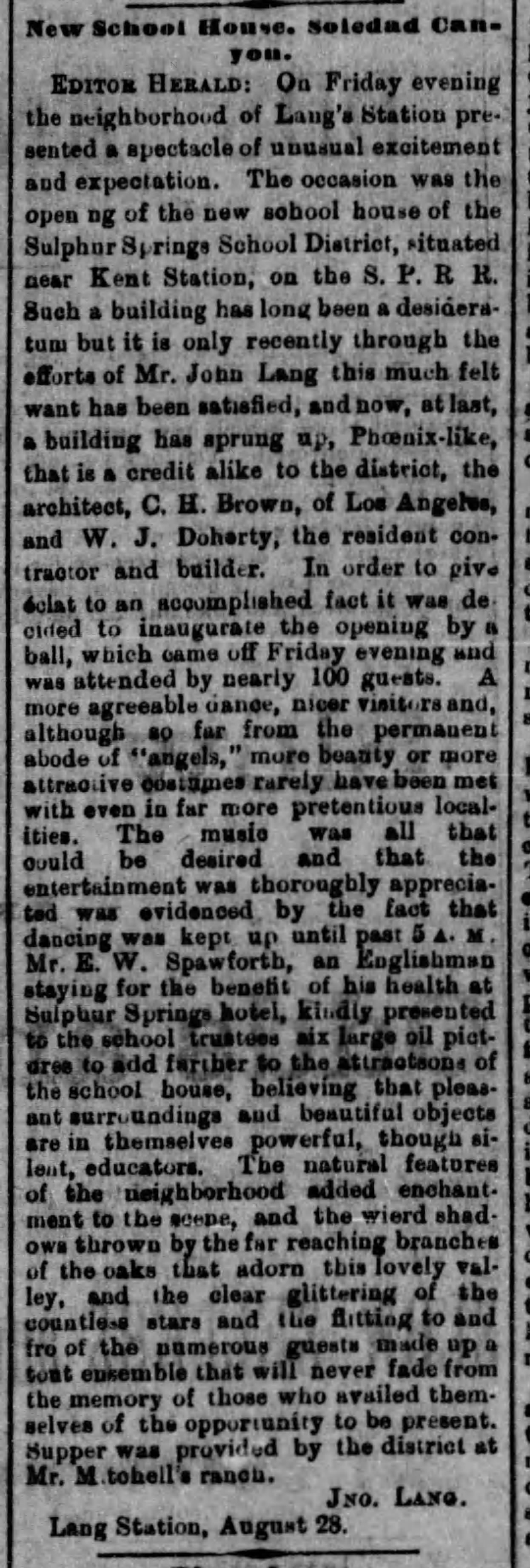 "Mr. John Lang, the projector, progenitor and proprietor of Lang's Station, was in the city yesterday, preparing for the erection of his new hotel, of two stories high, 40x80 feet, with parlors and 21 rooms, at that station, with a post office and express office. This will be a pleasant place for tourists, hunters and wood-cutters in the Soledad canyon, and visitors to the chalybeate springs in that vicinity." [Chalybeate springs are mineral springs that contain a high concentration of iron, giving the water a distinct taste and, at times, a reddish appearance.]On May 22, 1884, the Los Angeles Herald "acknowledges a call from Mr. J. Lang, of Lang's Station. He is now sending forward the lumber to build his new hotel at that place." On October 25, 1884, to help pay for the lumber, Lang borrowed $2000 from the W.H. Perry Lumber and Mill Company of Los Angeles. To secure the loan, he mortgaged his patented 160 acre ranch. On April 9, 1885, the debt was paid off.[31]