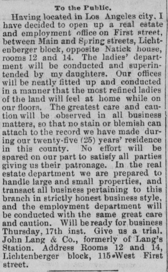 "The season so far has been the most favorable ever known in this section for planting trees, vines, shrubs and ornamental timber growth. Uncle John Lang is taking advantage of the unusually favorable season, and is now in your city purchasing a large variety of citrus and deciduous fruit trees, as well as ornamental shrubbery, to plant in the immediate vicinity of his new hotel building, erected last summer. He is also laying in agricultural implements and seed, with a view to utilize every acre of his valuable rancho. The farmers and fruit-men, as well as the bee-men, all anticipate another prosperous season and all are redoubling their efforts to make two blades grow where one grew before."This is the first time, but not the last, that the Herald prefaced "Uncle" to John Lang's name. He was a very respected and trusted man with the Herald and probably with his neighbors.