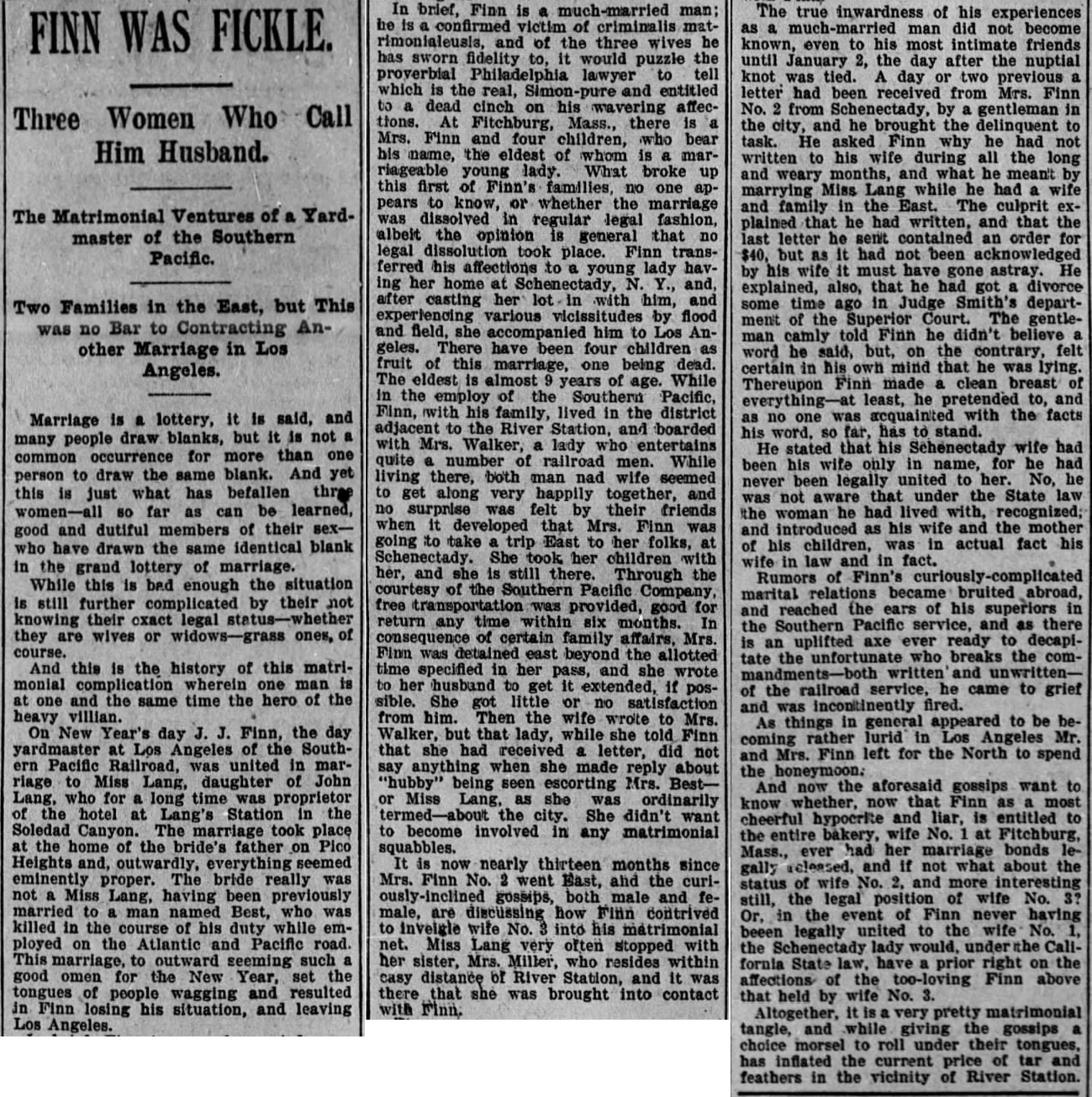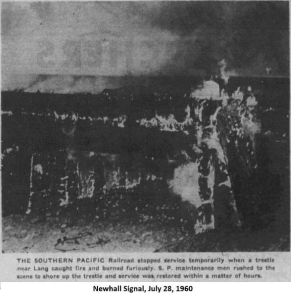"When the old frame hotel in Lang caught from an engine spark and went up in a puff of smoke and a roar of flame, men of the town at once realized the import of the affair. While the operator at Lang was telegraphing to stations along the line for help, the fire jumped from the hotel to the railroad company's buildings; and before the message was fairly ticked off it had left the town, and was racing through the undergrowth over the adjoining hills."From the Los Angeles Evening Express of October 6: