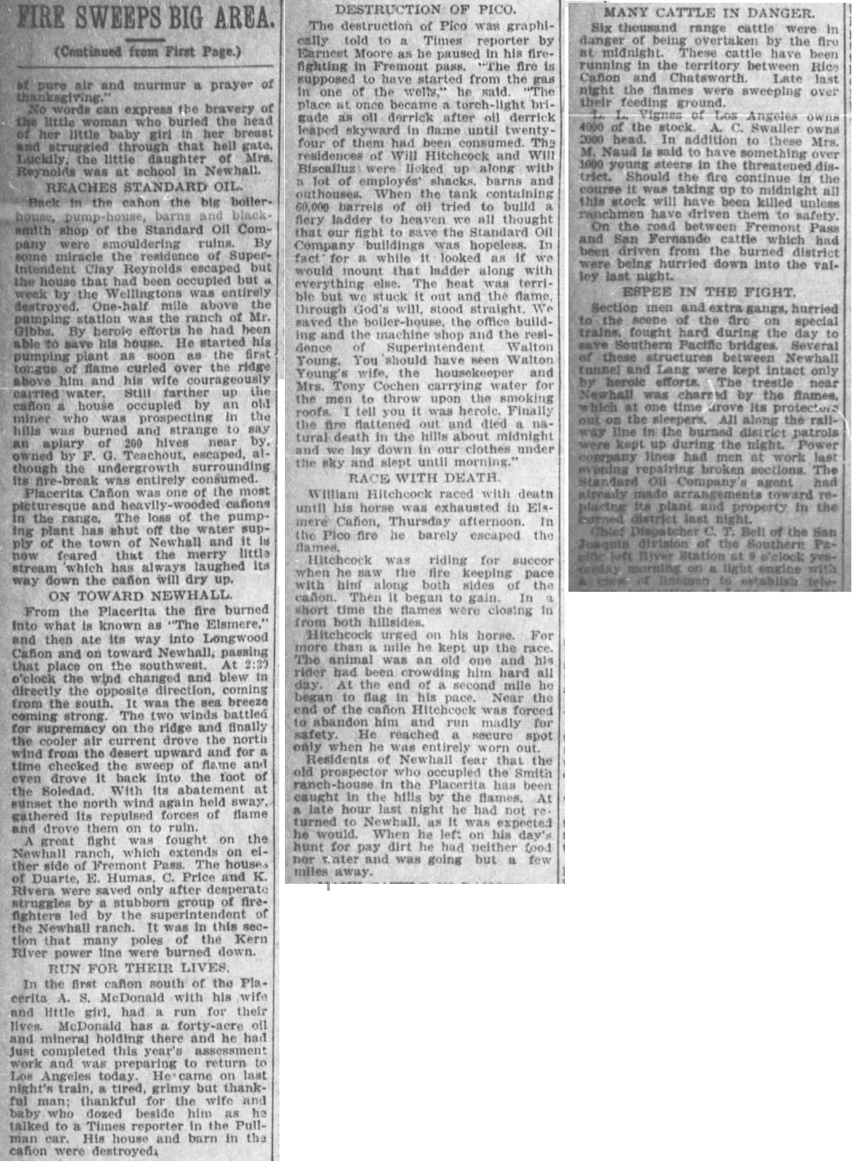 "Driven by a strong north wind, the hurricane of flame leaped across to the depot consumed it in a puff; slashed the supports from under the water tank, and blotted up its contents in a cloud of steam; gathered to its own the bunkhouse of a section gang and swept across the fields to the ranch of Deputy Constable Youngblood, three miles away. Five buildings, all of them small, and an olive orchard were but a morsel for the hungry flames, which raced on to the undergrowth and scattered oaks on the sides of the Soledad Canyon."