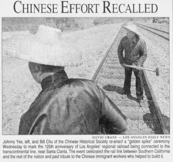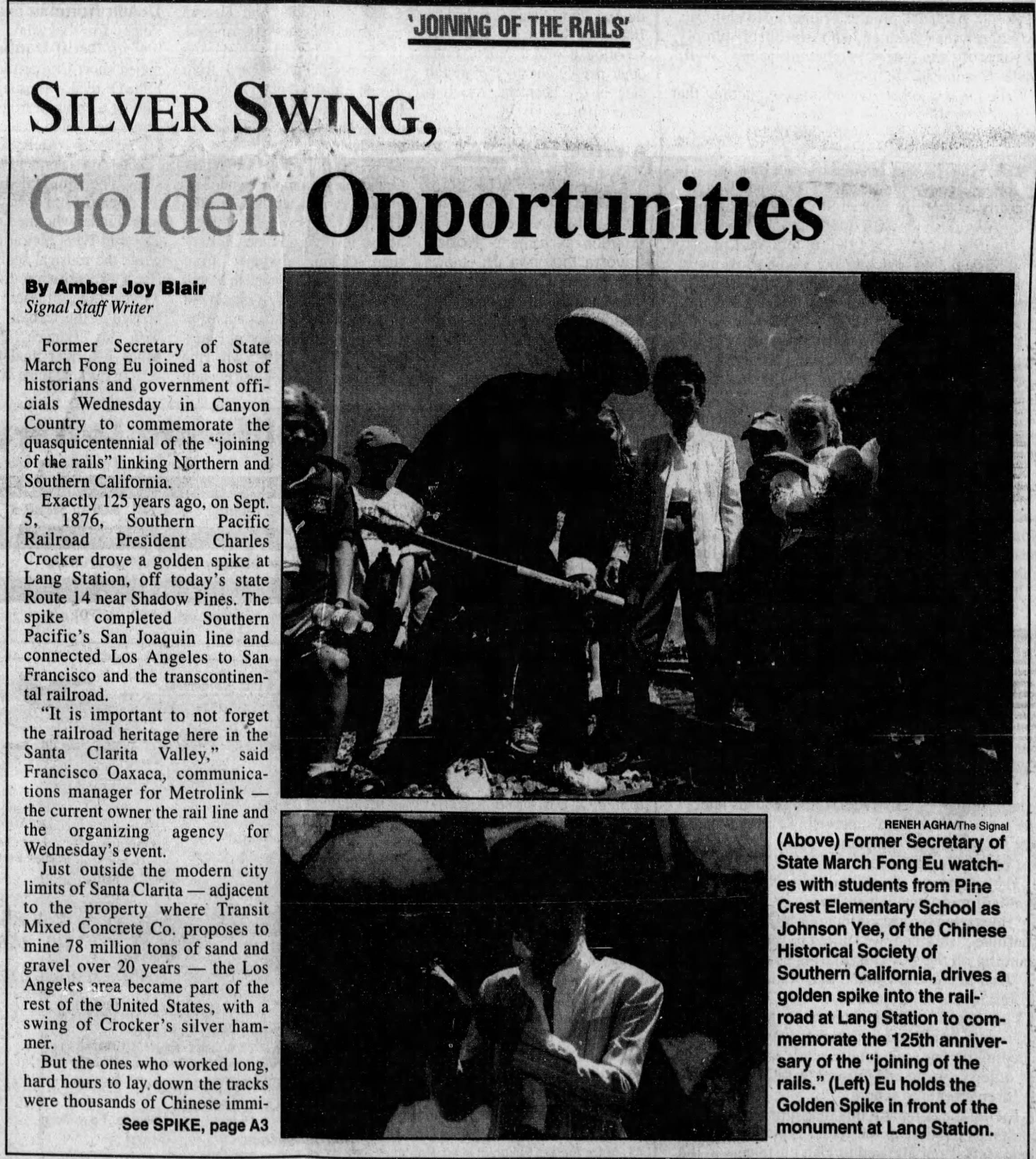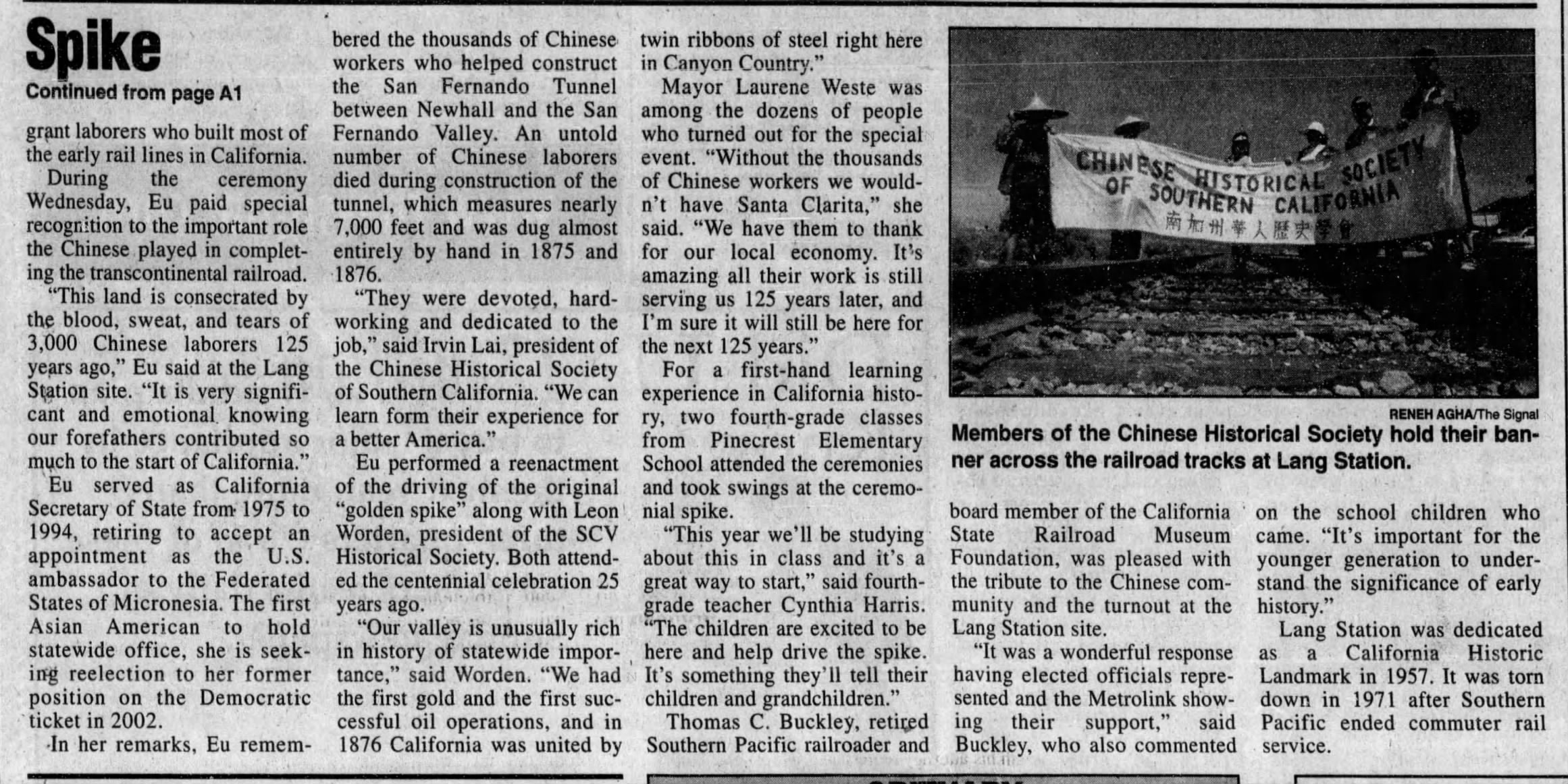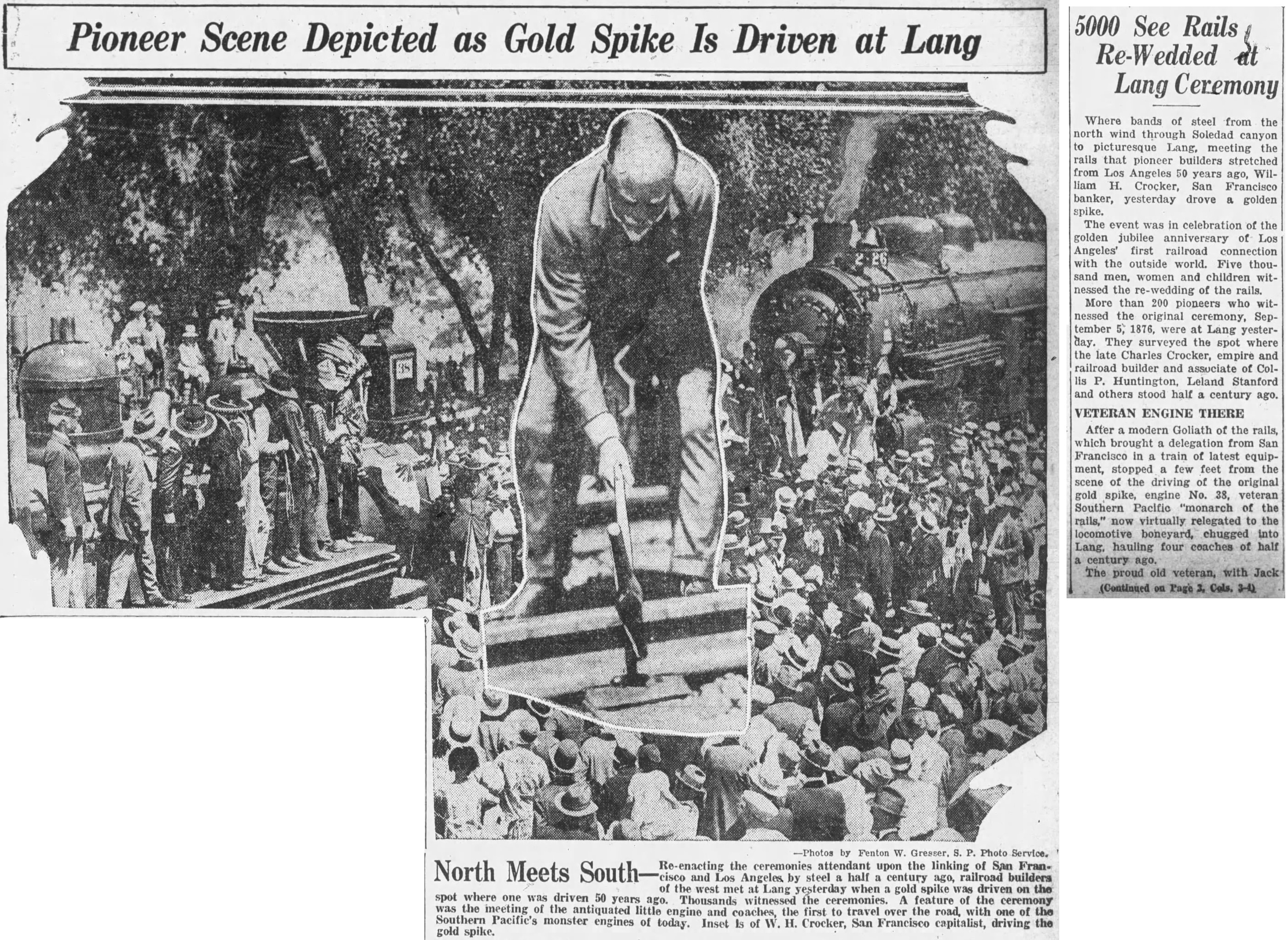 "A landmark, marking the linking of the Southern Pacific San Joaquin Valley line 81 years ago with the driving of a golden spike, will be dedicated at Lang Station in Soledad Canyon tomorrow [actually it was on the 15th]. On Sept. 5, 1876 construction crews completed the Southern Pacific San Joaquin Valley Line there and a golden spike was driven into the ties to join the rails. The original golden spike used almost 81 years ago at Lang's Station will be on public display for the first time at the Security-First National Bank, Farmers and Merchants Branch, June 17-21. It has been loaned for the week by the State Historical Society's library in San Francisco."The Newhall Signal of June 20, 1957, reported on the ceremony: