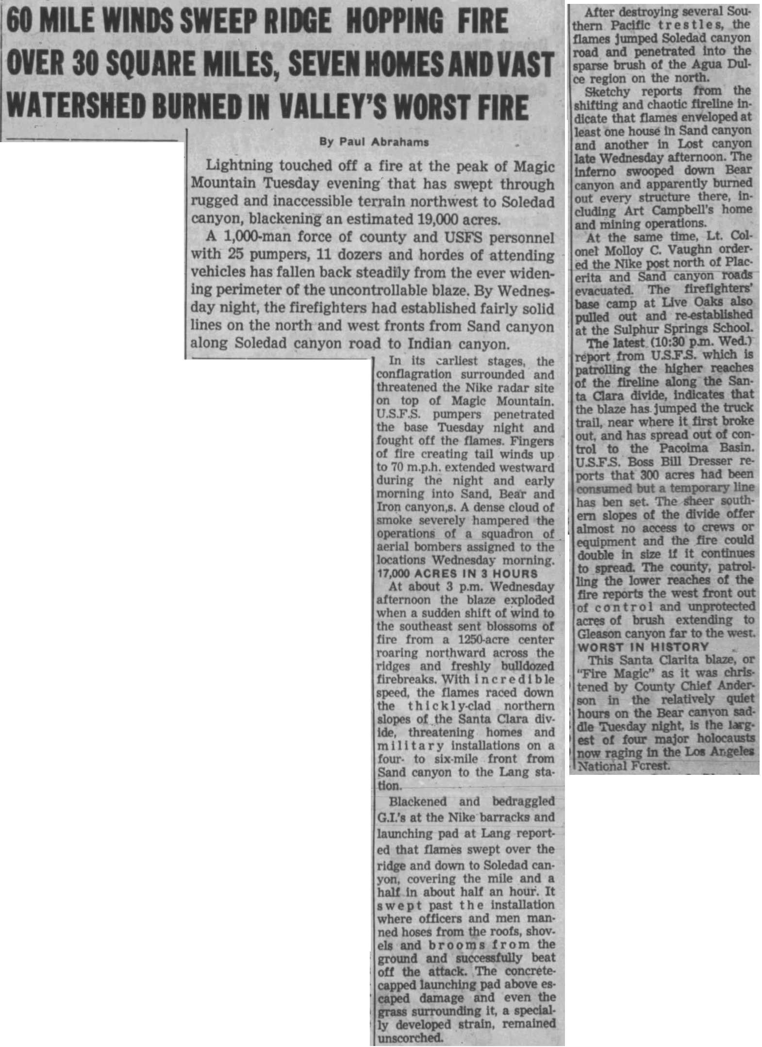 "Surging winds drove the Magic Mountain fire across Soledad Canyon in a burst of speed that blackened 11,700 acres in two hours yesterday. The Southern Pacific bridge [a 30-foot wooden trestle - see photo above] was burned at historic Lang Station. The blaze missed the station, but rushed on to Aqua Dulce Canyon, where it was moving today toward Vasquez Rocks."