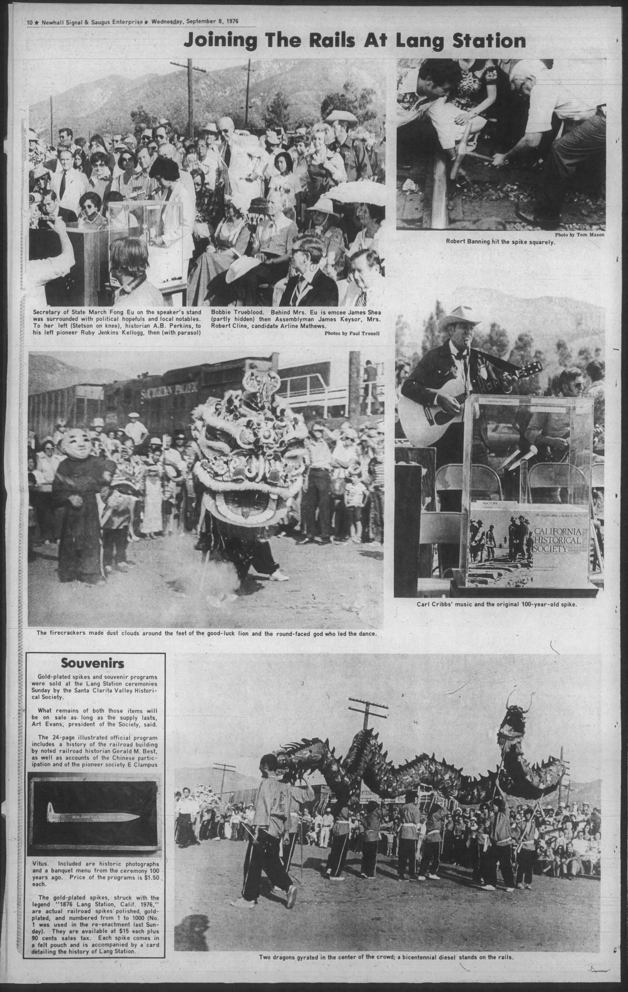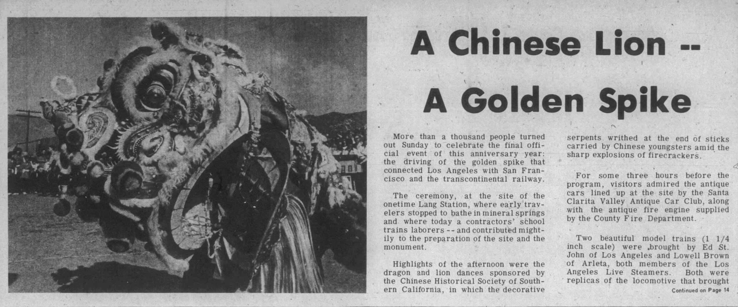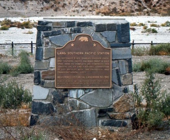 "Saturday morning [the 15th], a temporary plaque (to be replaced by one of bronze very shortly) was set upon the old railroad station at Lang, commemorating the driving of the golden spike that completed the railroad, Sept. 6, 1876, by the Historical Society of Southern California. The ceremony opened with the presentation of the old building by a representative of the Southern Pacific Railroad to the Society, the setting of the plaque designating 'California Historical Landmark No. 590', and acceptance by representatives of the Historical Society, and adjournment to Saxonia Park..."