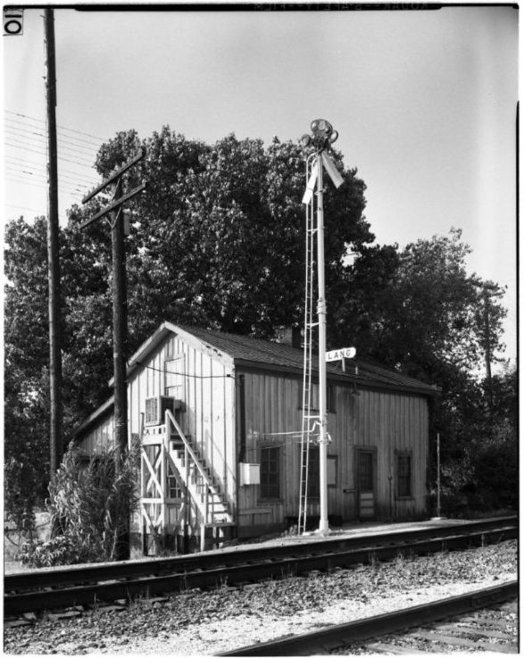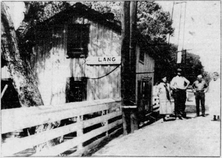 The position of the "Lang" sign can roughly date the photos. Before about 1940, there were two signs, one on each side of the station. After that, there was only one sign and it was located on the roof. Also, the stairs on the south side of the building were constructed no earlier than 1947. There was no door there, the stairs were just used to access a window air conditioner. They became affordable starting in about 1947 and popular starting in the 1950s. Another later dating device is that around 1960, there were two utility poles next to the south side of the station. The shorter one nearer the tracks had two crossbeams. The taller one had no crossbeams.