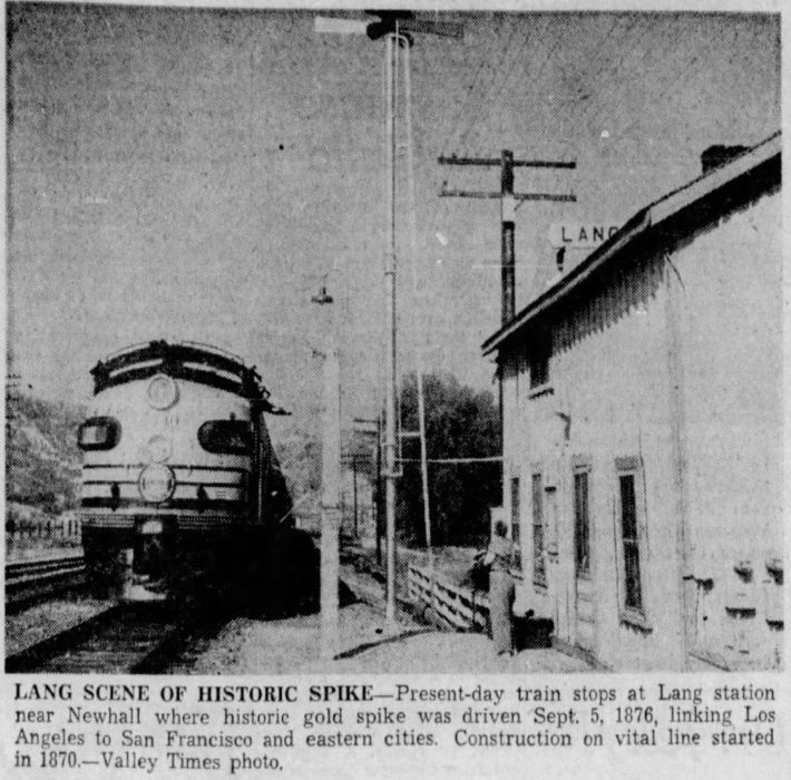 From the Los Angeles Times of February 27, 1955. The spike was driven in 1876 not 1875. There is no air condition at the top of the stairs.