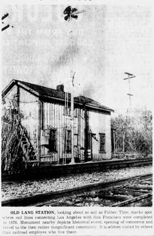 From the Newhall Signal of March 23, 1961. Caption: "Mrs. Murphy stands in front of the old Lang Station - where as a little girl, she sometimes stood to see folks from the City de-training for Lang's resort. At left center, Walter Murphy stands before the monument and plaque of California Registered Historic Landmark No. 590, commemorating the driving of the Golden Spike. To the left of the big tree, beyond Mr. Murphy, the writer [A.B. Perkings] stands by the foundation of the old Lang Hotel, of 1870's." Again, note how close the stone monument is to the end of the picket fence. The two utility poles at the south end of the station can also be seen.