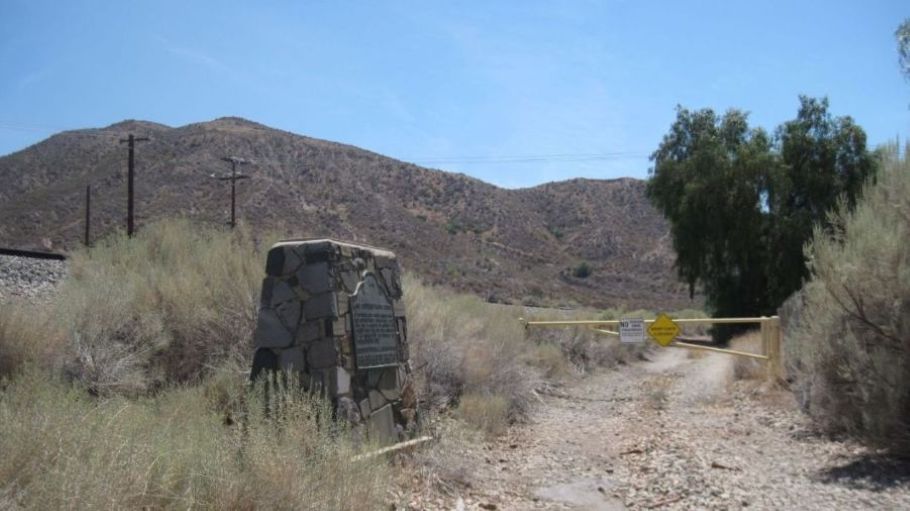 Sometime between 1968 and 1976, the stone monument was moved from its original position south down the railroad tracks just past their intersection with Lang Station Road, a distance of about 1/4 of a mile. Here it is in its new position. Note that you are now facing the tracks when you read it. The Santa Clara river bed is to my back. This is the opposite direction the plaque was originally facing. (Photo by me 8/3/2025)