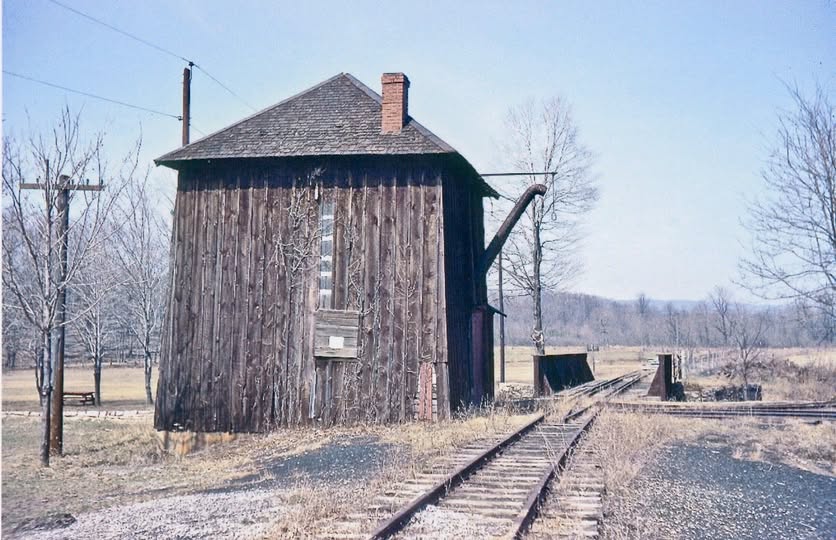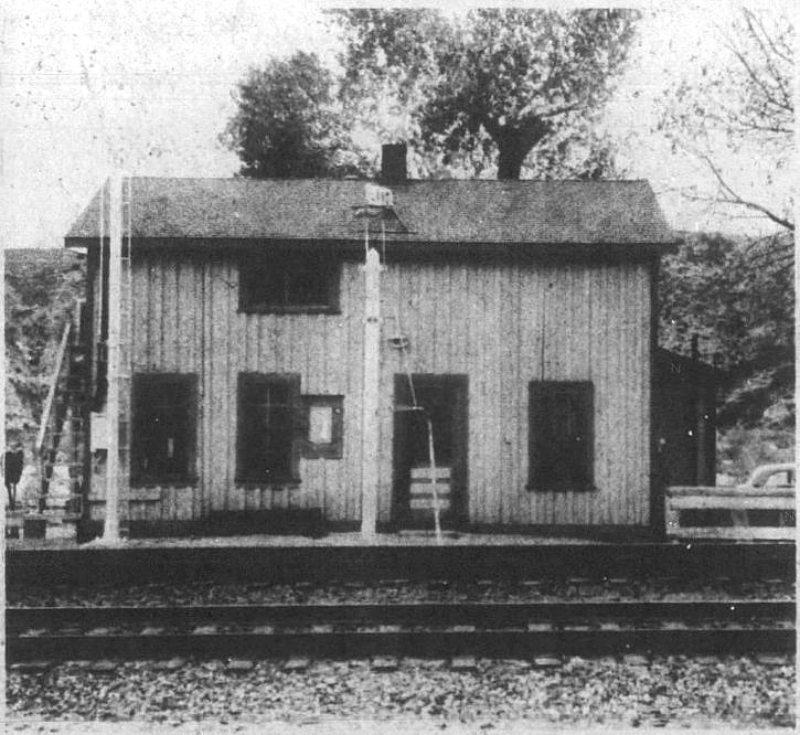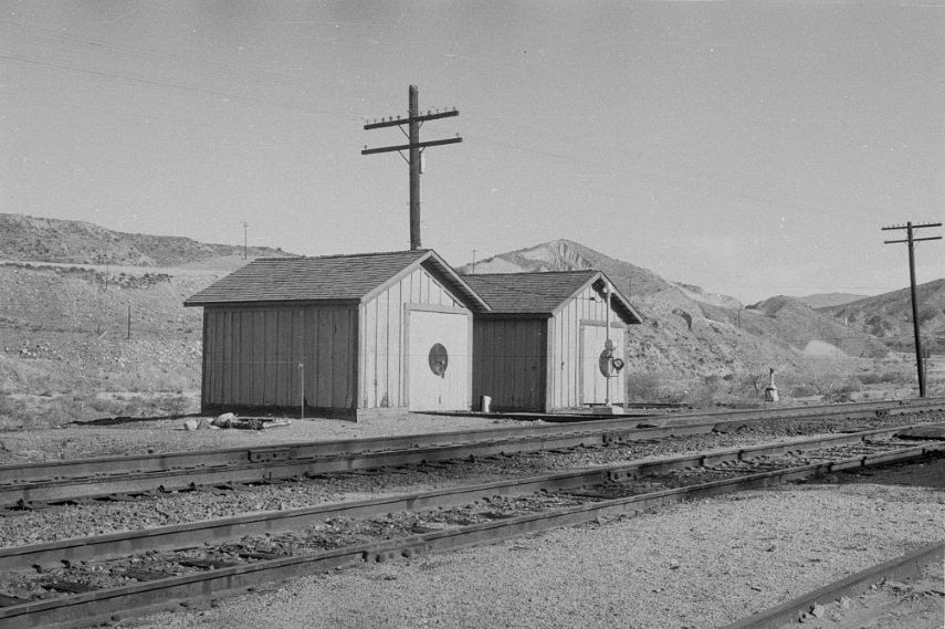 The oldest known photo of Lang Station depot, 1888. Shown is the one-story depot and, on the opposite side of the tracks a water tank in a square building. Early railroad water tanks were sometimes enclosed in square buildings. The square-shaped structure typically housed the tank and a pumping station, providing protection from the elements, especially in colder climates. The spout on the side of the building is a dead give-a-way that there is water tank inside. (Here is an 1957 example from Saltillo, Pennsylvania.) We cannot tell whether the depot was on the Santa Clara River side of the tracks or not. It was built in 1888 and burned down in 1888. This photo is also shown in the book Railroading through the Antelope Valley, by Phil Serpico, Omni Publications, Palmdale, Ca., 2000, p. 66. There it was stated that, after the fire, operations were transfered to the section house, which evidently survived the fire. The section house/depot would remain as one until the building was demolished in (probably) 1968. The dimensions of the section house were 16ft x 30ft with a lean-to of 12ft x 16ft on the backside.