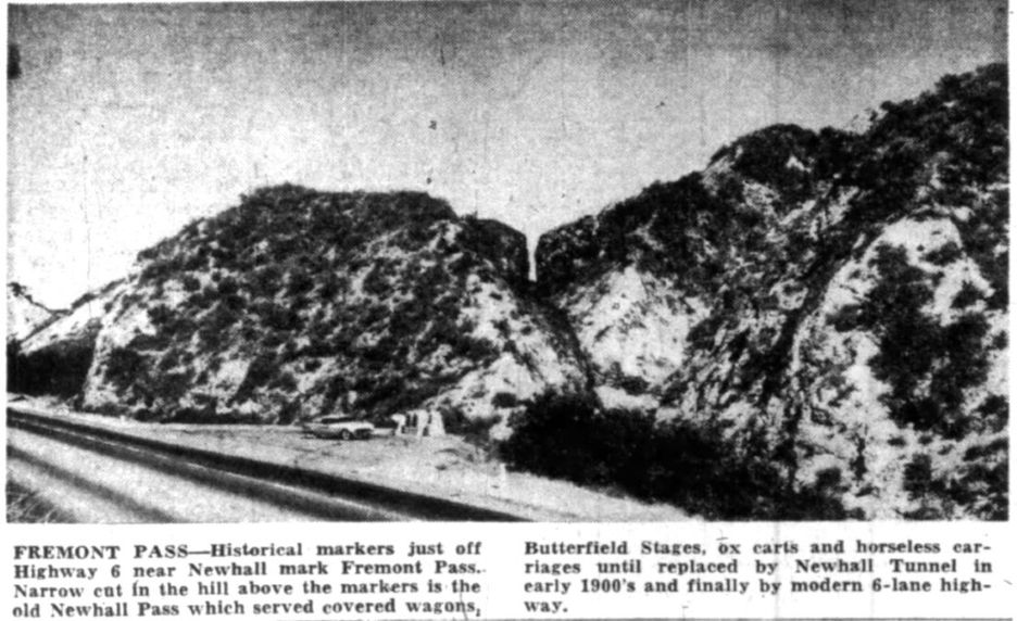 "The writer, in company with Auguste Farrier [an early rancher in Newhall] took a look over the mountains in the vicinity of the [Newhall] tunnel and the 'Fremont Pass', Tuesday. From a careful observation, and without survey, it seemed almost impossible to consider the cut known as the pass as a feasible route for a road. At least fifty feet additional depth would be required to make the grade at all passable from the south, and the north is almost as bad...And by the way the supposed Fremont Pass, is not the Fremont road at all Mr. Farrier states. He showed a path, which plainly had been a trail over the mountain, and had been at one time a wagon road. This, he says, was the real road used by Fremont, while the pass was cut for a toll road, and was so used for many years."