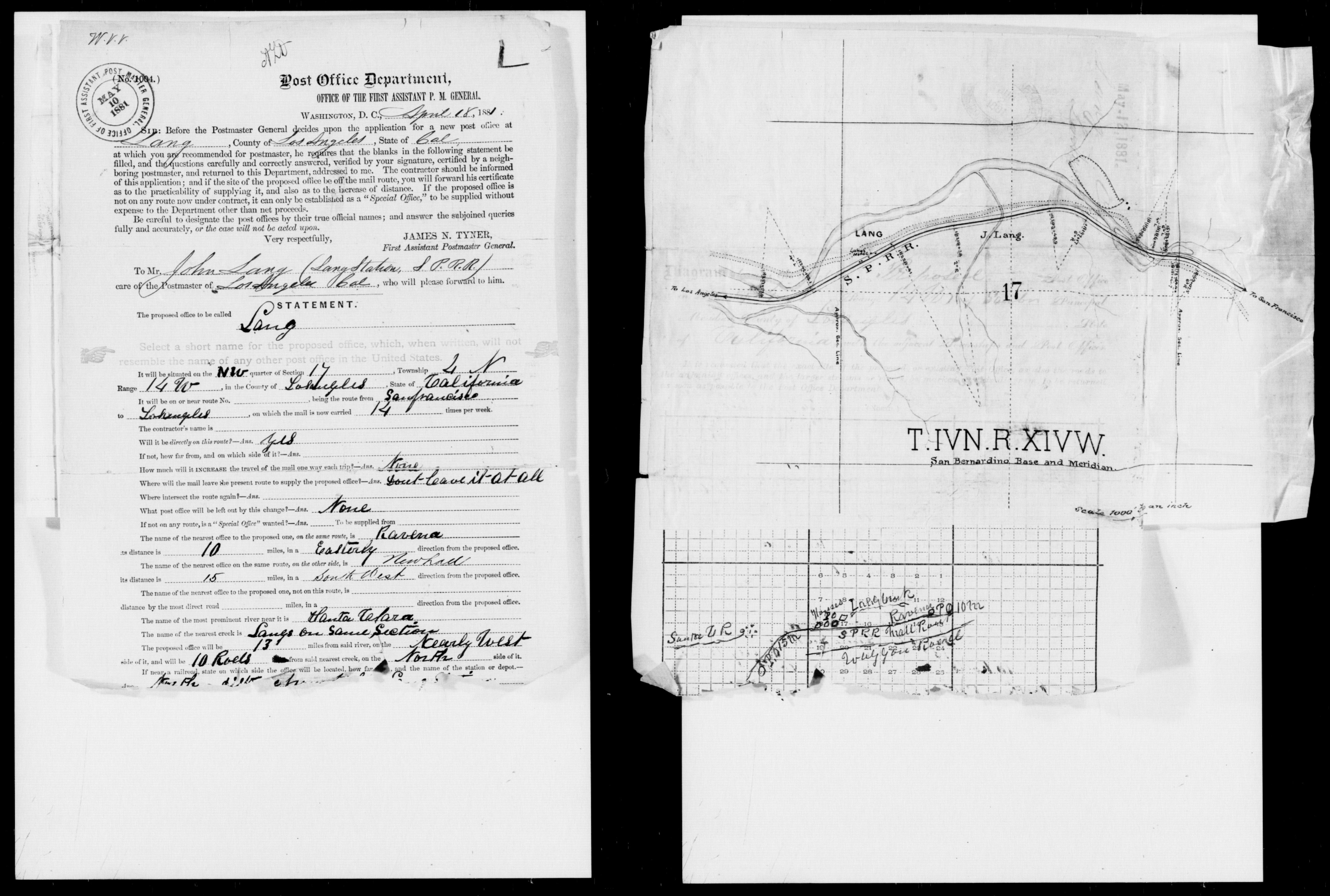 "Mr. John Lang, the projector, progenitor and proprietor of Lang's Station, was in the city yesterday, preparing for the erection of his new hotel, of two stories high, 40x80 feet, with parlors and 21 rooms, at that station, with a post office and express office. This will be a pleasant place for tourists, hunters and wood-cutters in the Soledad canyon, and visitors to the chalybeate springs in that vicinity." [Chalybeate springs are mineral springs that contain a high concentration of iron, giving the water a distinct taste and, at times, a reddish appearance.]On May 22, 1884, the Los Angeles Herald "acknowledges a call from Mr. J. Lang, of Lang's Station. He is now sending forward the lumber to build his new hotel at that place." On October 25, 1884, to help pay for the lumber, Lang borrowed $2000 from the W.H. Perry Lumber and Mill Company of Los Angeles. To secure the loan, he mortgaged his patented 160 acre ranch. On April 9, 1885, the debt was paid off.[31]
