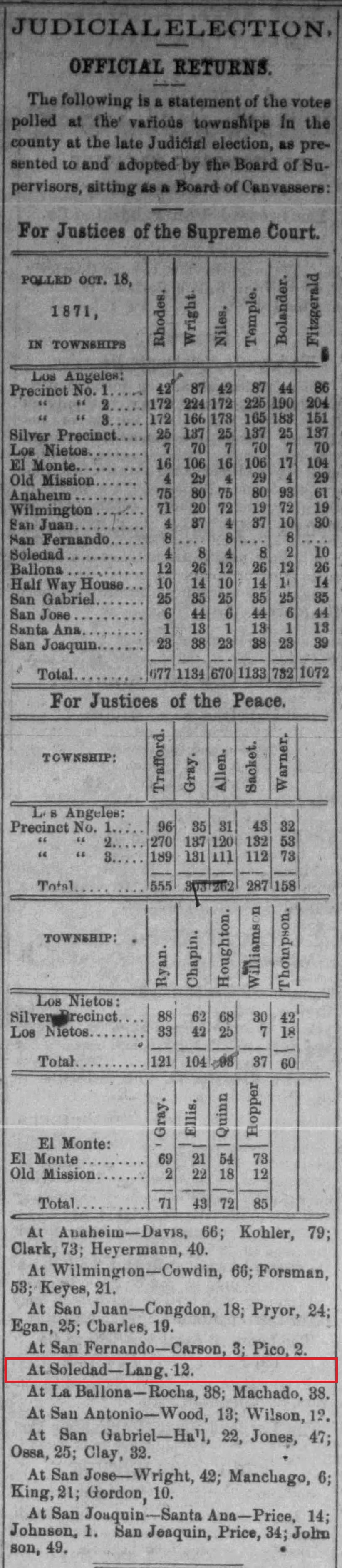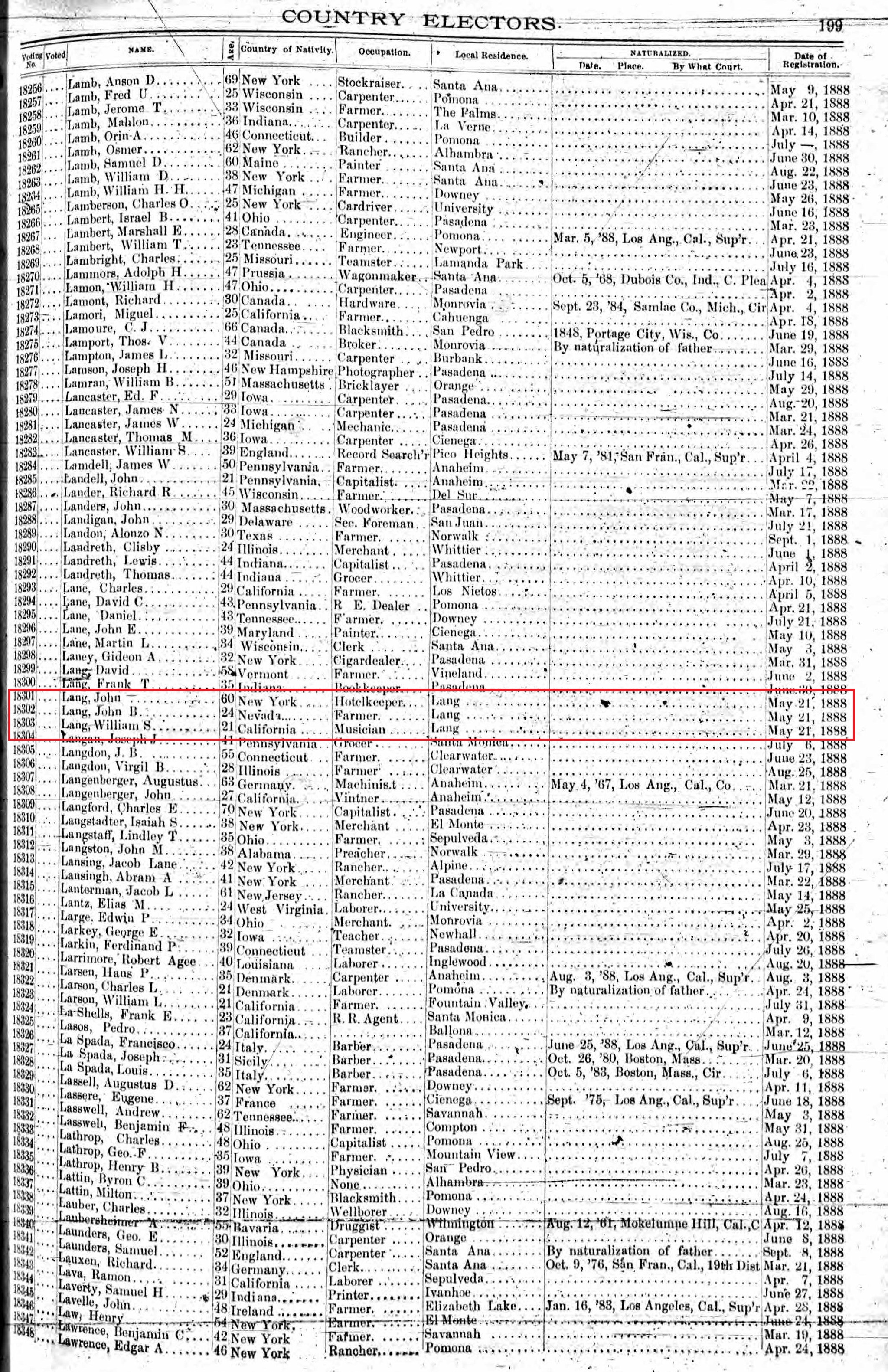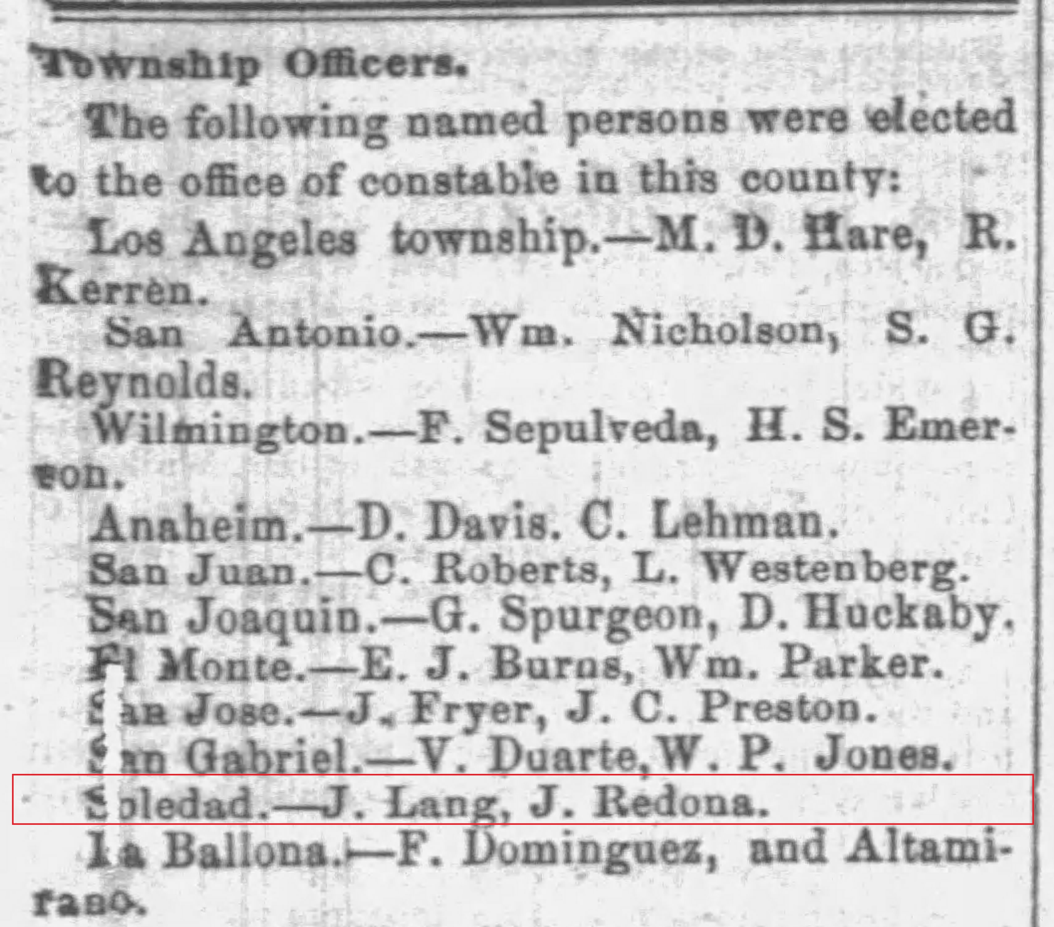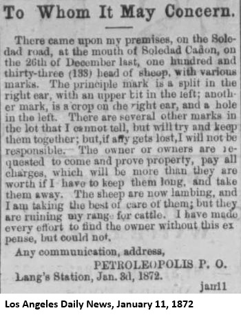 "The season so far has been the most favorable ever known in this section for planting trees, vines, shrubs and ornamental timber growth. Uncle John Lang is taking advantage of the unusually favorable season, and is now in your city purchasing a large variety of citrus and deciduous fruit trees, as well as ornamental shrubbery, to plant in the immediate vicinity of his new hotel building, erected last summer. He is also laying in agricultural implements and seed, with a view to utilize every acre of his valuable rancho. The farmers and fruit-men, as well as the bee-men, all anticipate another prosperous season and all are redoubling their efforts to make two blades grow where one grew before."This is the first time, but not the last, that the Herald prefaced "Uncle" to John Lang's name. He was a very respected and trusted man with the Herald and probably with his neighbors.