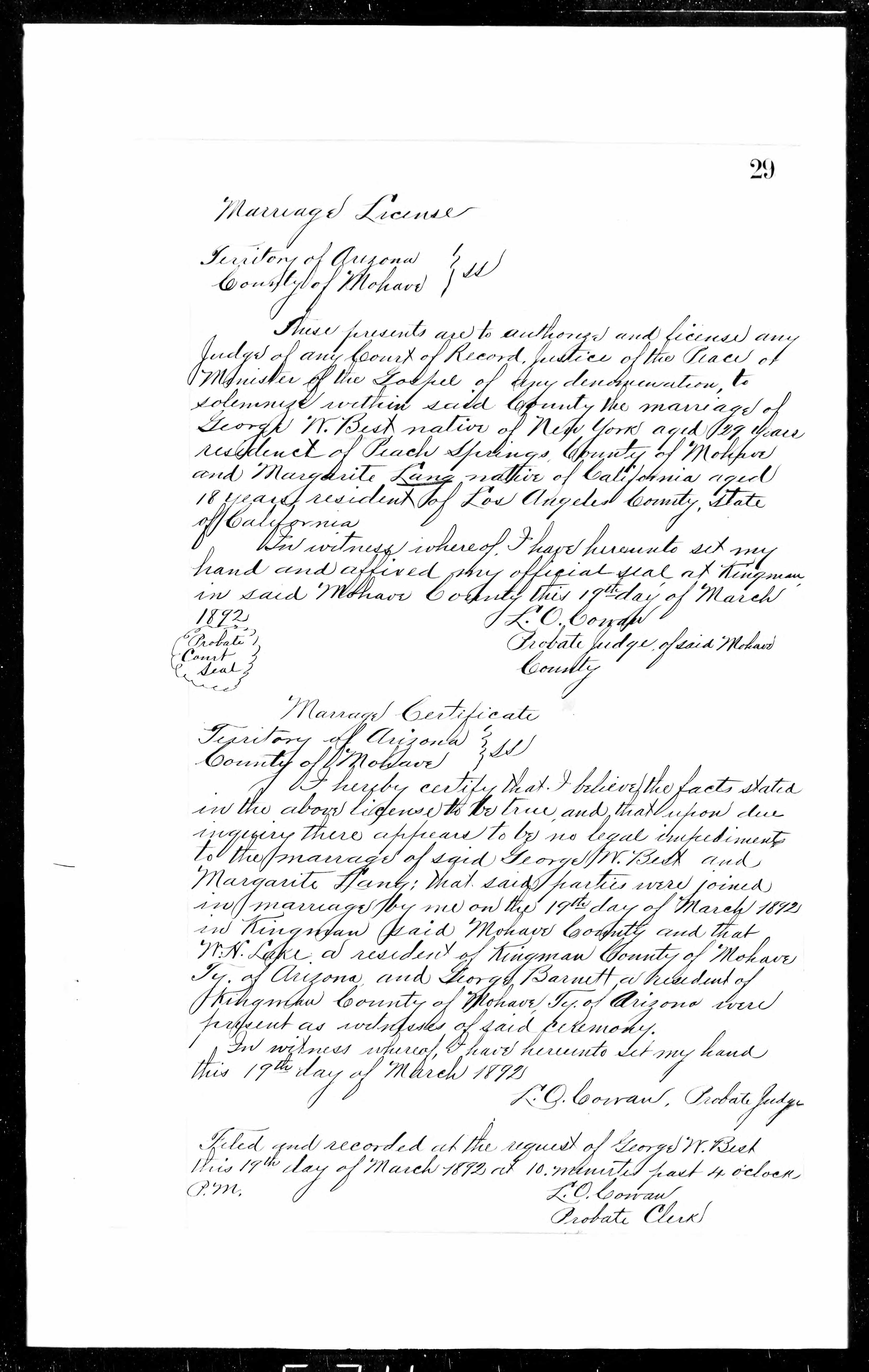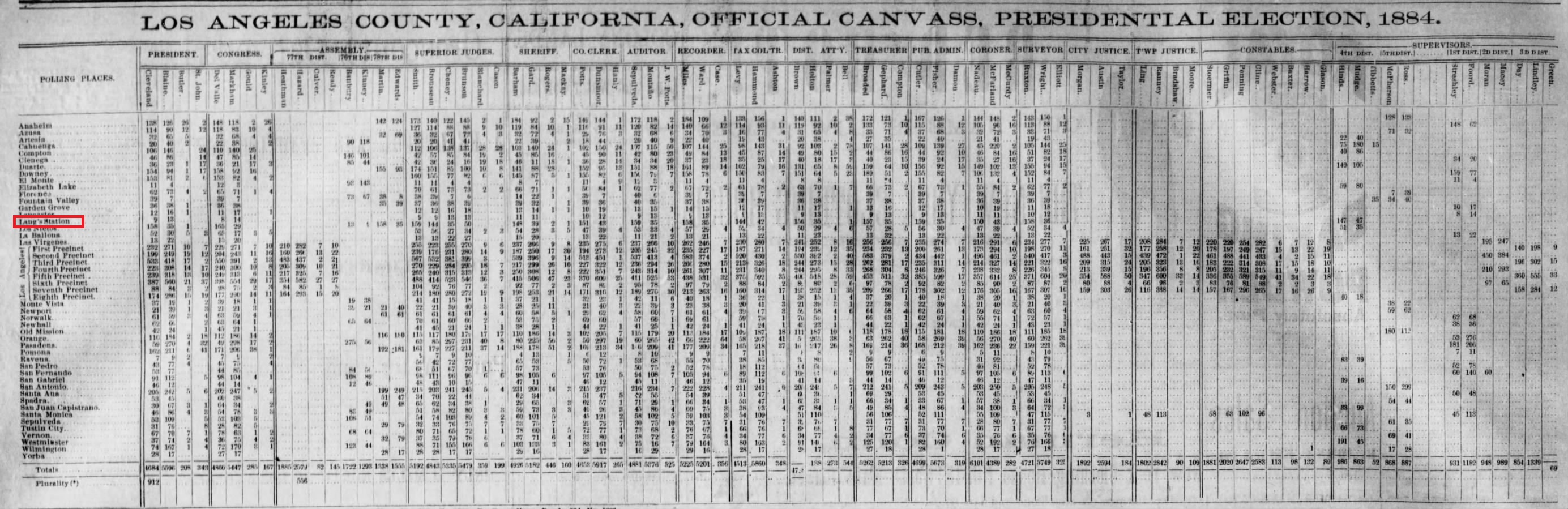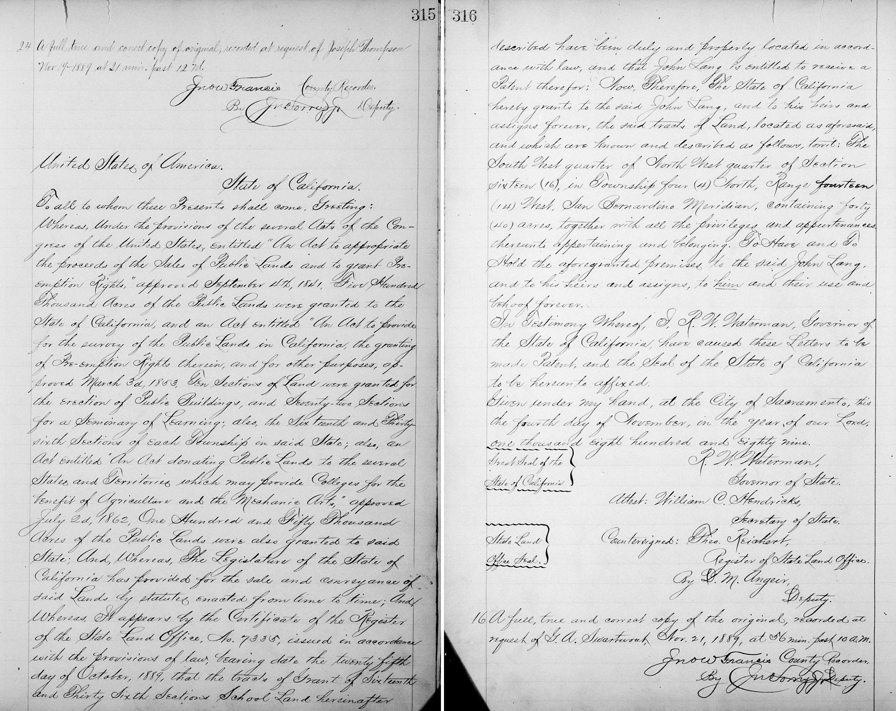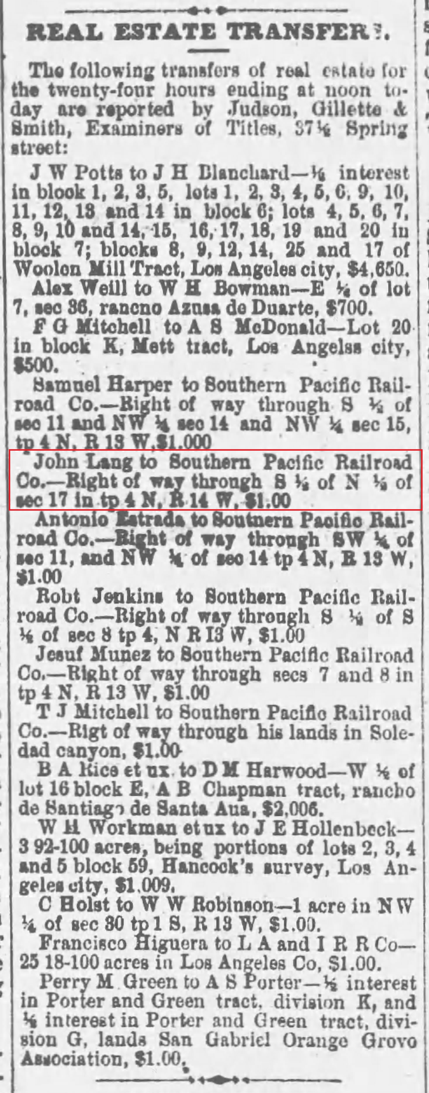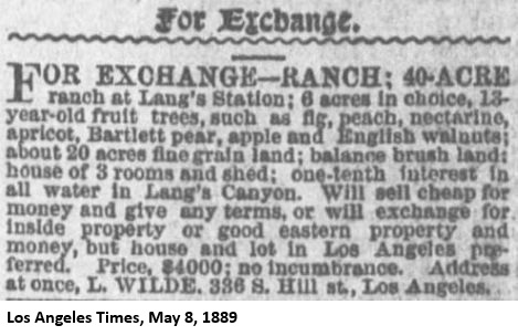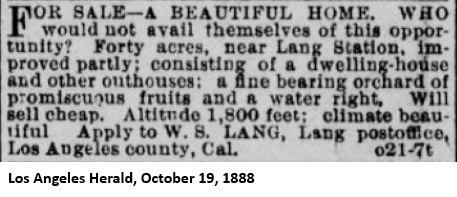 "Mr. John Lang, of Lang Station, Southern Pacific railroad, has sold his old home, where he has lived for the last twenty years, for the sum of $30,000 [yes, $30,000] - a most lovely place, at an altitude of 2,000 feet, no fogs, pure water as the earth affords, and the finest pure white sulphur springs ever known. Mr. Lang can relate some of the most remarkable cures effected at these springs that history ever recorded. The world probably affords no healthier spot. All diseases of the human family here find a remedy. Having lived for twenty-five years near these springs, I know what I am saying, and I have no interest in any way in the property, but only desire to do what good I can for the world while a little time is left me. The property has been purchased by Mr. C.A. Steele, of Los Angeles city, a gentleman of high order. A hotel, railroad offices, express, postoffice, schools, etc., are here. While Mr. Lang kept the house open for business he was thronged, the house not being one-fourth large enough.The transaction was recorded on September 16, 1889.[47] On that same day, Steele sold half interest in the property to George A. Swartwout (1850-1929) for $12,000.[48]