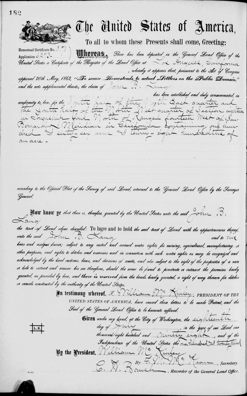 "was formulated by C.H. Clayton, of Lang, Los Angeles county, Cal., who is a regular correspondent of the P.B.J, a township justice, postmaster, and a successful manager of a few hundred stands of bees. Mr. Clayton's Senate Bill 135, was introduced by Representative Simpson, and was passed and approved by Governor Budd February 23d. This bill makes a misdemeanor of the adulteration of honey, punishable by a fine or not less than $25, nor more than $400, or imprisonment of from twenty-five to six months in the county jail, or both fine and imprisonment."1900 was an end-of-era year for Lang's Station. In January, the last Lang left the area. On January 17, 1900, John Broderick Lang sold his homestead, which he had just received a patent for two years earlier, for $540.65 to E.A. Miller of the firm of Miller & Herriott, Los Angeles real estate and loan agents.[59] J.B. and his family then moved to Simi Valley. They were listed on the 1900 US Census (taken in June) for the Simi Township.
