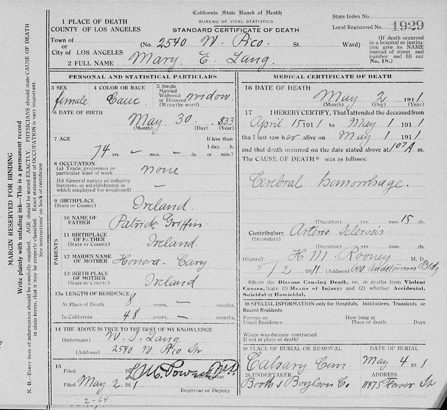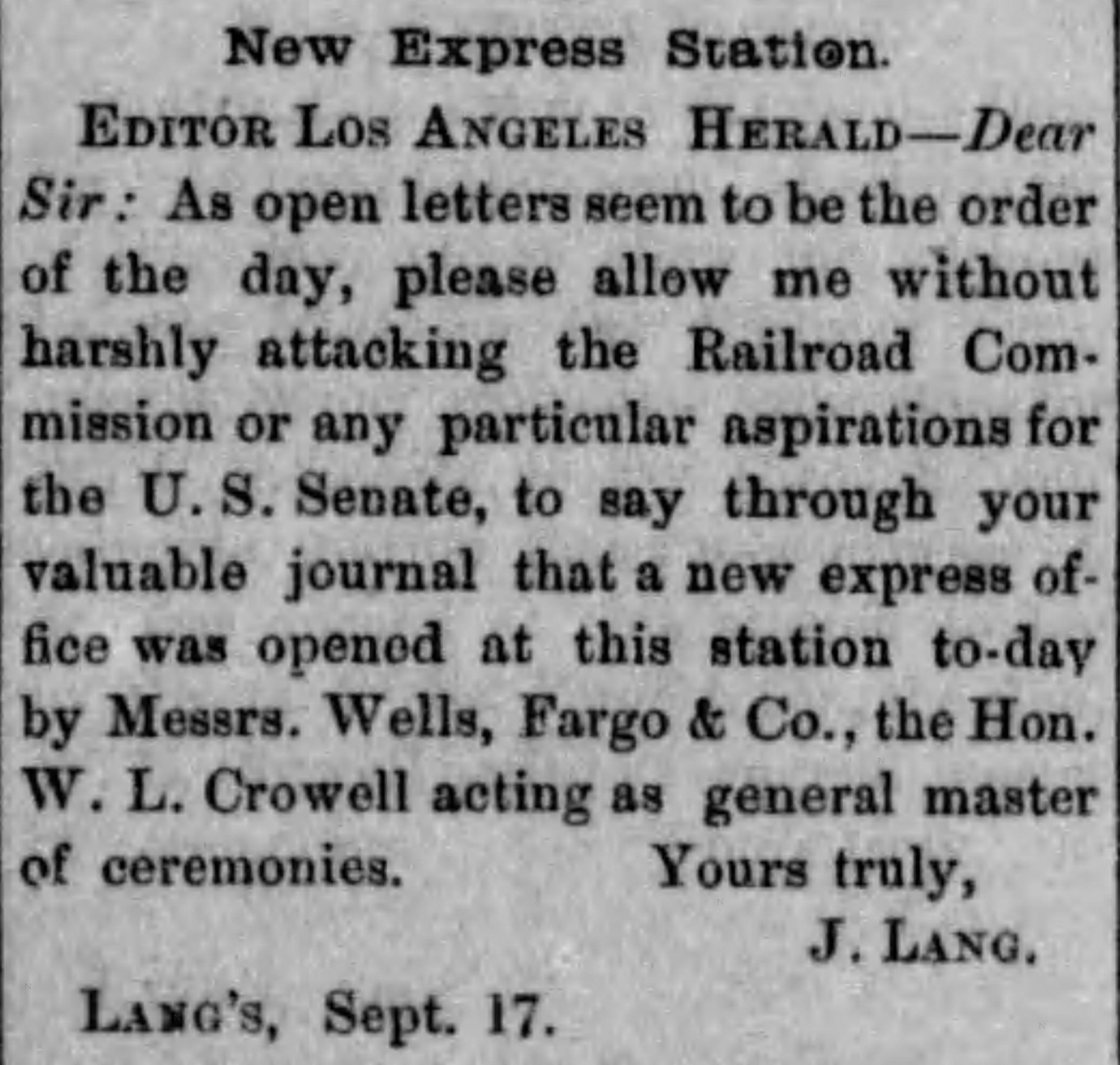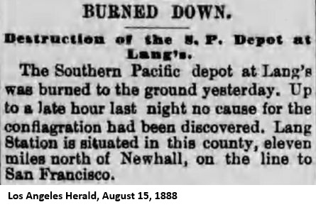 "When the old frame hotel in Lang caught from an engine spark and went up in a puff of smoke and a roar of flame, men of the town at once realized the import of the affair. While the operator at Lang was telegraphing to stations along the line for help, the fire jumped from the hotel to the railroad company's buildings; and before the message was fairly ticked off it had left the town, and was racing through the undergrowth over the adjoining hills."From the Los Angeles Evening Express of October 6: