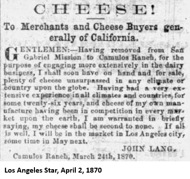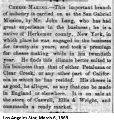 "At Lang's Station some two hundred acres are under cultivation, planted in barley, corn, fruit and vegetables, which produce the most wonderful crops. A late visit to Mr. Lang's orchard of a thousand trees, found his apple, peach, pear, quince, apricot and prune trees loaded down with fruits, until the trees had to be propped up to deep the limbs from breaking down. His fruits are of the choicest varieties and bring a big price at the ranch. His figs, nectarines, olive and walnut trees were also very fine, while the whole orchrd as well as his vines are entirely free from insects, smut or other drawbacks, to be found in lower altitudes. In his gardens can be found the choicest crisp vegetables to be found in the country, growing the year round. Cabbage, celery, carrots, chickory, corn, lettuce, potatoes, turnips, radishes, rutabegas, melons, strawberries every month in the year, as well as many other vegetables usually raised in this climate.That was quite a rosy picture painted. It is hard to believe that everything said there was true (1000 trees?), but there is no doubt that John Lang was doing well there, rain or no rain. Also, John Lang was a dairyman, so there were probably cows somewhere on his property. He was well known for his cheese making abilities.
