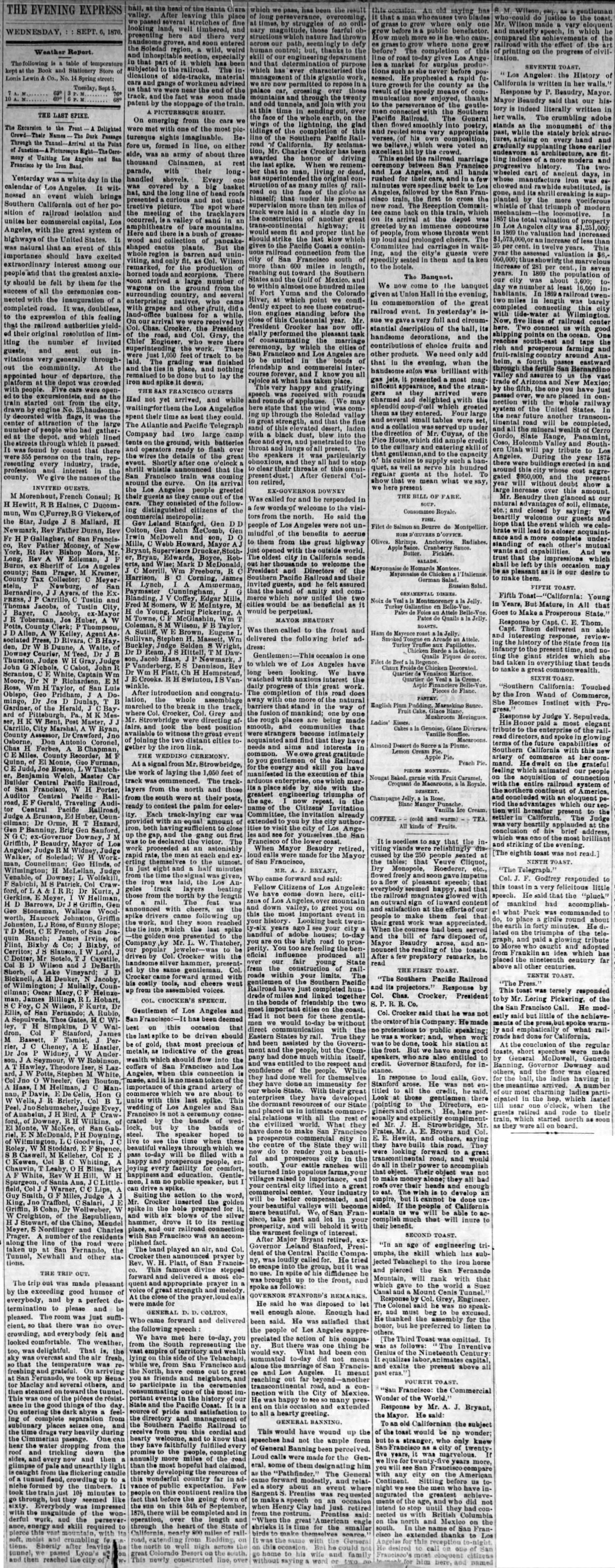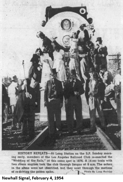"A landmark, marking the linking of the Southern Pacific San Joaquin Valley line 81 years ago with the driving of a golden spike, will be dedicated at Lang Station in Soledad Canyon tomorrow [actually it was on the 15th]. On Sept. 5, 1876 construction crews completed the Southern Pacific San Joaquin Valley Line there and a golden spike was driven into the ties to join the rails. The original golden spike used almost 81 years ago at Lang's Station will be on public display for the first time at the Security-First National Bank, Farmers and Merchants Branch, June 17-21. It has been loaned for the week by the State Historical Society's library in San Francisco."The Newhall Signal of June 20, 1957, reported on the ceremony: