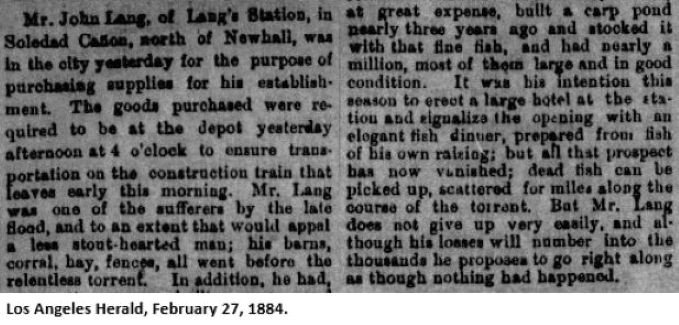 "My hotel at the present writing is surrounded with every kind of flowers, and roses that can be seen in full blossom. Also tomatoes and everything else are as fresh as in May. Altitude, 1820 feet. My bath rooms will be completely fixed up during the next month. Pipes will be laid to bring sulphur water to the hotel, and warm and cold baths will be in order in fine style. This will be a mountain health resort for tourist parties who can get around and help themselves. Nothing of a hospital nature will be allowed or practiced. Plenty of fine hunting grounds, horses, carriages, saddles, etc., on hand, and all kinds of fruits grown here at the Springs. Everything here that makes life pleasant. Extensive olive groves are being planted here this season. The intention is to make this the attractive resort of the coast. We know positively our springs are superior to anything in the line of sulphur water on this coast, and, as for climate, I can say, after sixteen years residence right here [since 1870], I have never known its equal. Many healthy people are traveling the world today who thank Lang's Station for it. Here is a school, post-office, ticket, express and telegraph office; excursion tickets on sale. Everything has been arranged to suit the convenience of all. Hotel kept on first-class principles. Charges reasonable. Very truly, John Lang, Proprietor. January 17, 1886."Meanwhile, the railroad was again suffering due to the rainy weather. The Herald of January 21, 1886: "The lines to San Francisco are all down, the whole railway and telegraph equipment from Lang's Station to Ravena having been demolished for the time being. It is estimated by the Southern Pacific Railway officials that it will be fully three weeks before the rails will be in working order to points north of Newhall. Yesterday Wells, Fargo & Co. began shipping their mail and packages to San Francisco by steamer." Los Angeles Times of January 21: "From Lang north to second crossing of creek the condition is as follows: One mile north of Lang 900 feet washed out 10 feet deep. A quarter of a mile north of this 700 feet are washed out 12 feet deep - rails and ties gone. Ninety feet of 8-foot fill at south of seventh crossing gone." Herald of January 23: "Above Lang's Station the $100,000 iron bridge is a complete wreck, part of it being carried upwards of twenty yards down stream. The wooden bridge is also wrecked, and the immense stone work made after the flood of two years ago was carried off like sand. The track in ten or twelve places is wrecked for varying from 20 to 150 yards." Finally, on January 29, the Times reported that "after the tedious ten days' blockade of railroad communication with the north, the siege is at last raised. At 4:30 p.m. yesterday the first train from the north since Monday, January 18th, pulled into the Los Angeles depot, bringing a lot of passengers, but no mail except 'pick-ups.'"