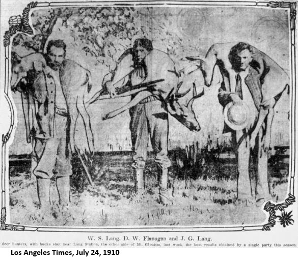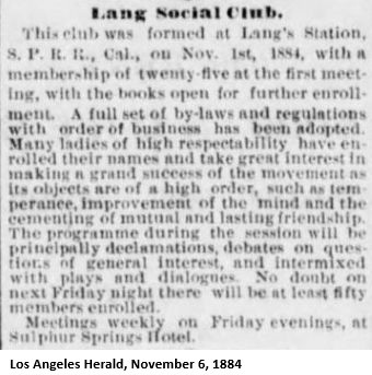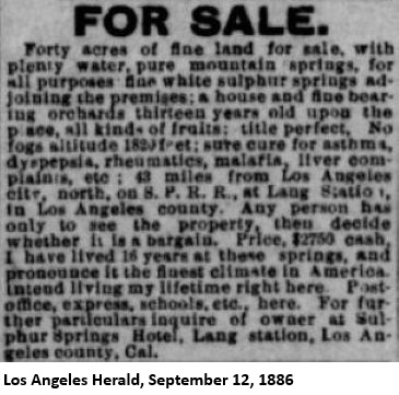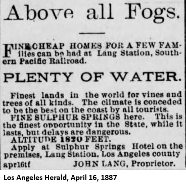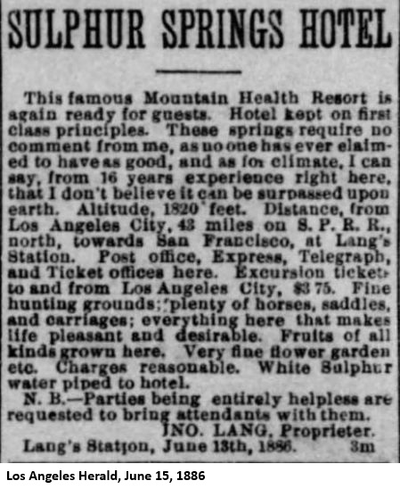 "On a recent visit to Lang's, about 40 miles north of Los Angeles, I was driven over to see a magnificent, inexhaustible ledge of gypsum. Here, said I, is an opportunity of establishing plaster-of-paris works. I inquired of the owner, Mr. Lang, if he would be willing to assist in establishing such a manufacture, and he immediately expressed his hearty concurrence in the scheme. The present is a good opportunity to engage in a profitable enterprise, where the capital outlay will be very small, and the process itself extremely simple. Mr. Lang will be very glad, I am sure, to show any capitalist or would-be investor the ledge. The present supply comes, I am informed, from New York round Cape Horn; so, surely, there must be a large margin of profit."As far as I can tell, this business was never started. The Los Angeles Times of December 5, 1885, reported that "John Lang, proprietor of the Sulphur Springs, is about to put hot and cold water baths in his hotel." The Los Angeles Herald of December 11, said that "John Lang is in the city to make preparations for bringing the water from his sulphur springs to his hotel at Lang's Station. He yesterday contracted for 5000 feet of water pipe for this object."