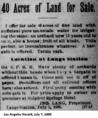 "The boom in real estate at this station is running very high at the present time. Many tranfers daily are being made. Large vineyards and orchards are being planted out, and people are flocking here from all directions. It seems as though the public have just found out that such a place as this section exists. The finest water and best climate in the world. Pure white sulphur springs. Altitude 1820 feet. Schools, post-office, express and ticket offices, finest fruit and vine land on the coast, that can, as yet, be had on cheap terms; but time is precious for those wishing homes in this locality. Land can yet be had, with plenty of water piped to the door, with a life title to same. Will sell in quantities to suit. Title perfect. For further particulars call and examine property. John Lang, proprietor of Sulphur Springs Hotel, will give particulars and show all parties around."