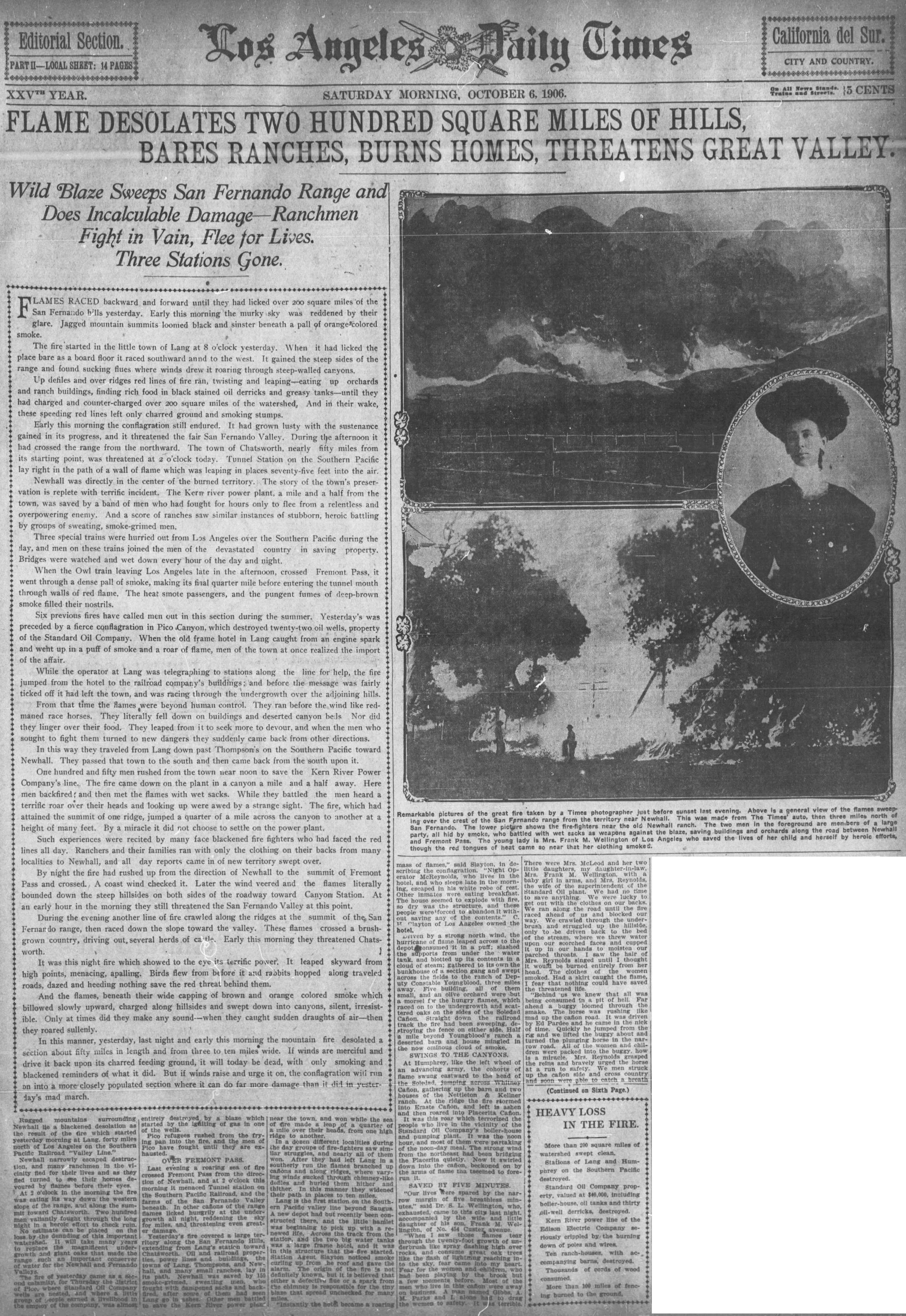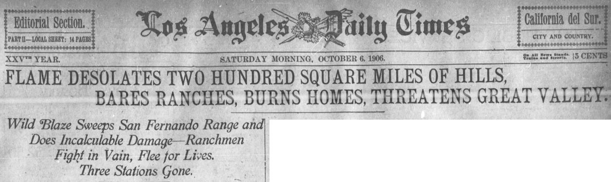 "Driven by a strong north wind, the hurricane of flame leaped across to the depot consumed it in a puff; slashed the supports from under the water tank, and blotted up its contents in a cloud of steam; gathered to its own the bunkhouse of a section gang and swept across the fields to the ranch of Deputy Constable Youngblood, three miles away. Five buildings, all of them small, and an olive orchard were but a morsel for the hungry flames, which raced on to the undergrowth and scattered oaks on the sides of the Soledad Canyon."