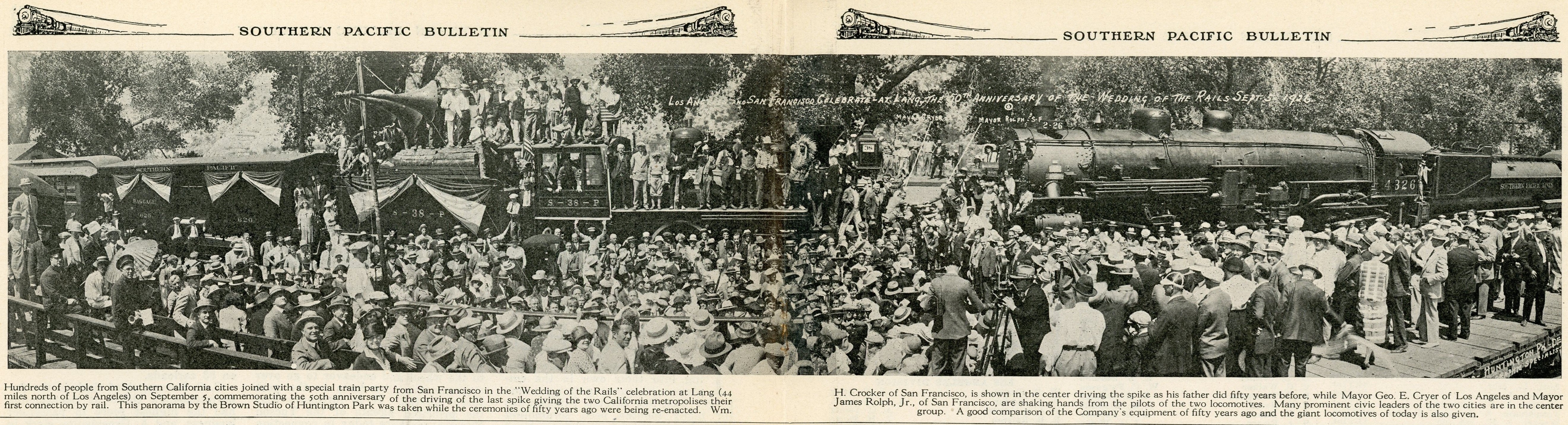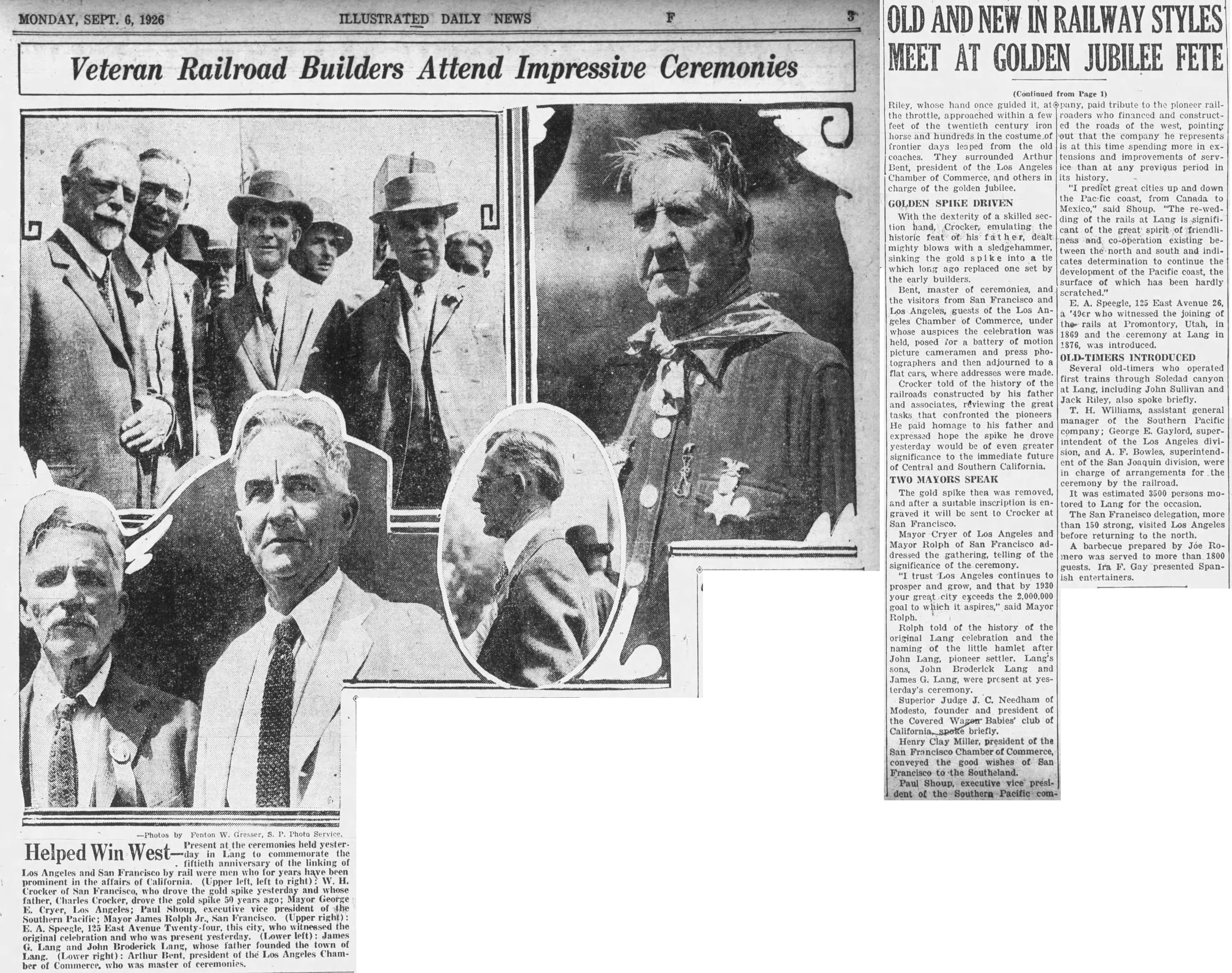 "Lang is a peculiar little station, a mere handful of railroad workers furnishing its only inhabitants. A water and a railroad siding are it chief adjuncts. At one time during the heyday of the Sterling Borax Company, a spur was built by the latter and joined the S.P. at Lang, where it was made a shipping point for both the crude and more refined ore. Nestled in the hills with trees and water near by, it presents a picture little indicating in its loneliness, and seclusion, that some day it would be aroused from a state of lethargy by thousands of visitors, with all the pomp of statesmen, to witness and celebrate the occasion when the last spike was driven in the great railroad that passes through the tiny hamlet. People living in the vicinity scarcely realize the day's significance, and wonder if their children will be present at the diamond jubilee. So on Sunday, September 5th, Lang will blossom and radiate a welcome to its guests as it has never done before. WELCOME!"There were many newspaper stories of the event including this one from the Los Angeles Daily Illustrated News of September 6 (Part 1, Part 2).