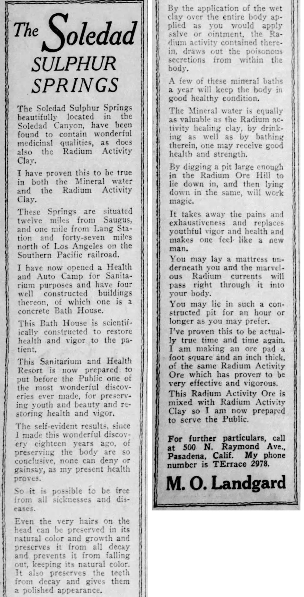 "Southern California is pre-eminently noted for the variety of its medicinal springs, both cold and hot. Besides those of a fluid nature, there are many hot mud-springs that are largely used in cases of acute rheumatism. Every county in Southern California has mineral springs of various kinds and utility. One of the most lovely and excellent groups of springs of a mineral character is the group of ten white sulphur springs at Lang, on the Southern Pacific Railroad, forty-three miles north of Los Angeles.Who could resist this?