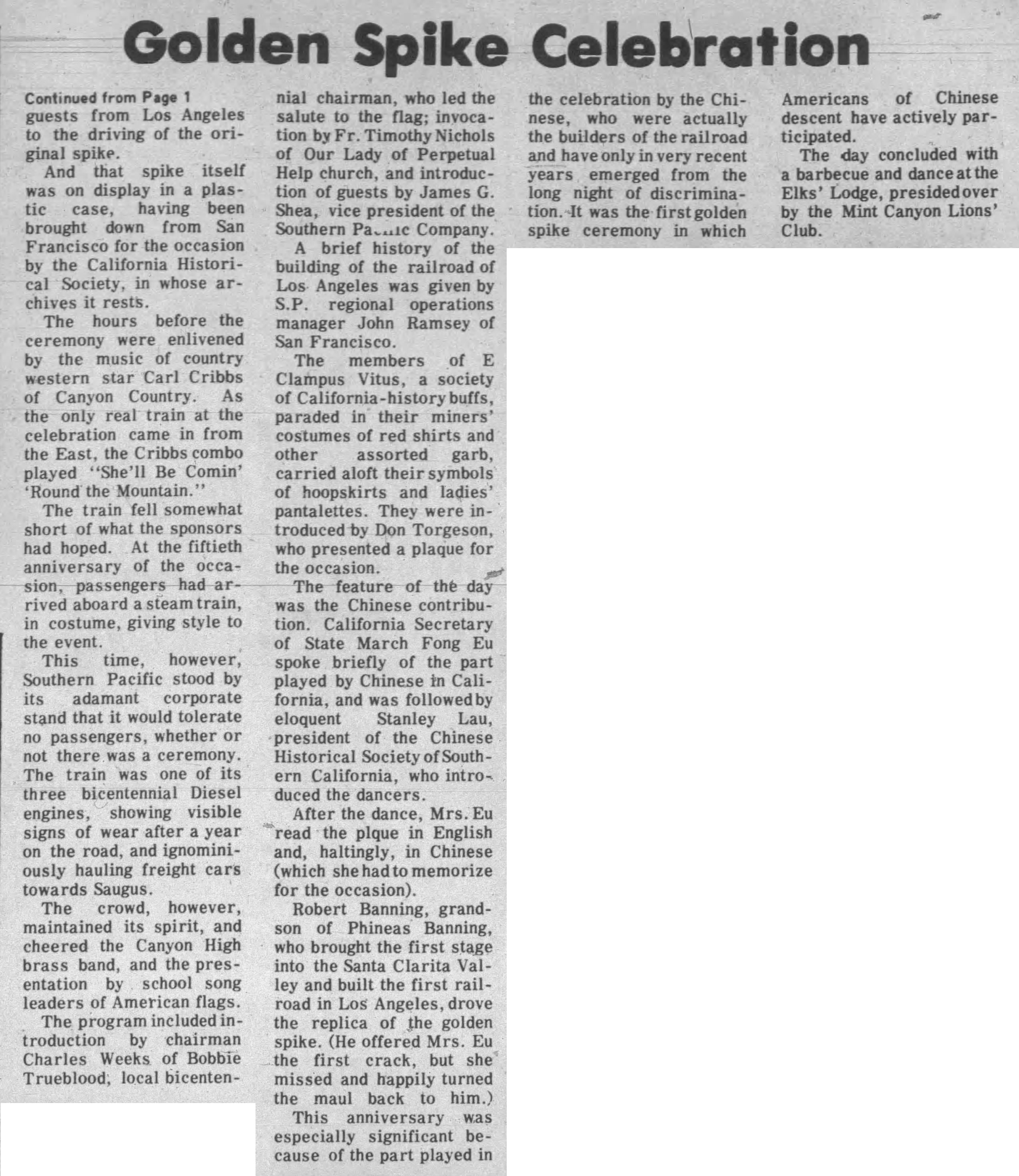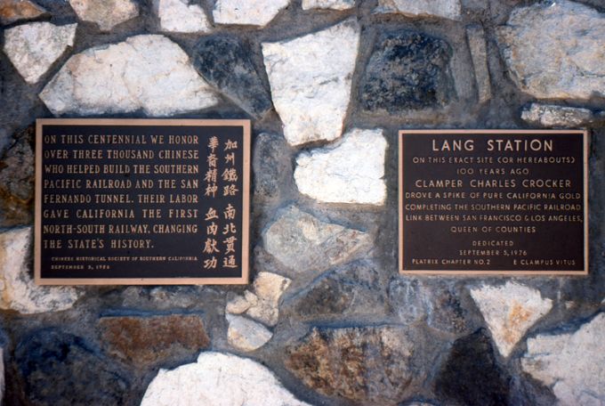 "Saturday morning [the 15th], a temporary plaque (to be replaced by one of bronze very shortly) was set upon the old railroad station at Lang, commemorating the driving of the golden spike that completed the railroad, Sept. 6, 1876, by the Historical Society of Southern California. The ceremony opened with the presentation of the old building by a representative of the Southern Pacific Railroad to the Society, the setting of the plaque designating 'California Historical Landmark No. 590', and acceptance by representatives of the Historical Society, and adjournment to Saxonia Park..."