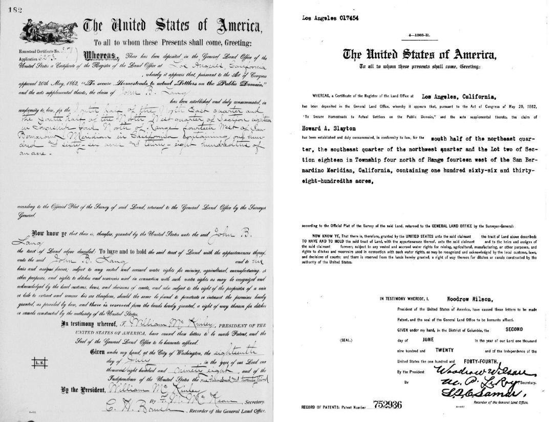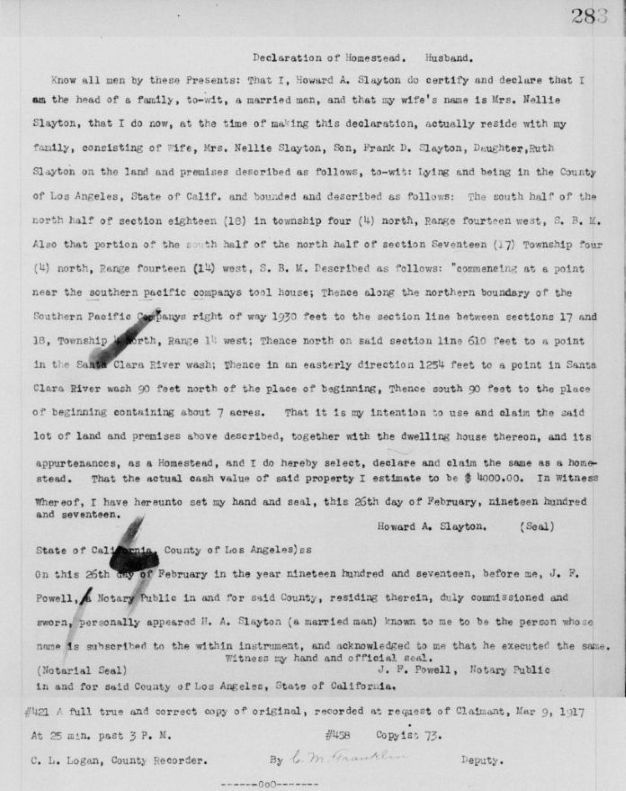 The homestead record of Howard Slayton filed on February 26, 1917. (LA Recorder's Office, Homesteads, Book 69, pp. 283-284.)
