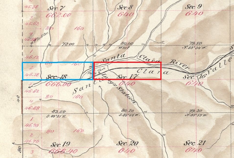 The blue rectangle contains the land of both patents. This map has lot numbers. The red rectangle is J.B. Lang's father's homestead, patented in 1882. Section of Plat Map for Township No. 4 North, Range No. 14 West, San Bernardino Meridian. Surveyed by W.H. Norway in 1879. Approved by Survey-General's Office, San Francisco, California, March 10th, 1880.