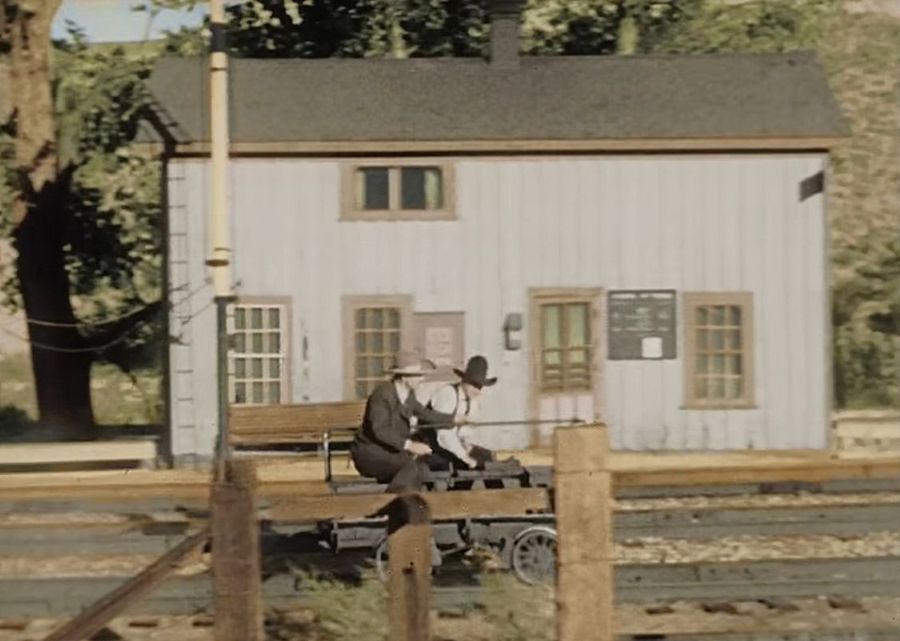 Scene from the 1934 John Wayne movie The Lucky Texan. Most of the movie was filmed in 1933. It was released on January 22, 1934. Directed and written by Robert N. Bradbury. Stars were John Wayne, Barbara Sheldon, George "Gabby" Hayes, Yakima Canutt. Restored, colorized, and renamed Gold Strike River in 2006 by Lone Star Productions, which is where this still was taken.