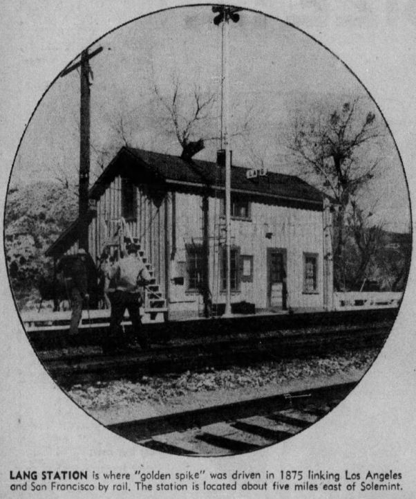From the Newhall Signal of March 23, 1961. Caption: "Mrs. Murphy stands in front of the old Lang Station - where as a little girl, she sometimes stood to see folks from the City de-training for Lang's resort. At left center, Walter Murphy stands before the monument and plaque of California Registered Historic Landmark No. 590, commemorating the driving of the Golden Spike. To the left of the big tree, beyond Mr. Murphy, the writer [A.B. Perkings] stands by the foundation of the old Lang Hotel, of 1870's." Again, note how close the stone monument is to the end of the picket fence. The two utility poles at the south end of the station can also be seen.