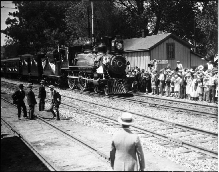 September 5, 1926. "Wedding of the rails." 50th anniversery of the 1876 golden spike ceremony when the railroad tracks from the north were joined with the tracks from the south. Note that the "Lang" sign is on the side of the building. California Historical Society Collection, USC Libraries Special Collections