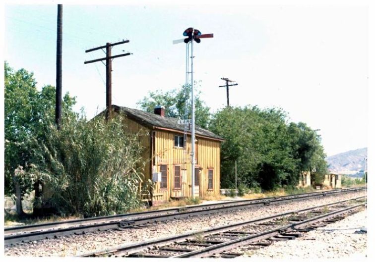The oldest known photo of Lang Station depot, 1888. Shown is the one-story depot and, on the opposite side of the tracks a water tank in a square building. Early railroad water tanks were sometimes enclosed in square buildings. The square-shaped structure typically housed the tank and a pumping station, providing protection from the elements, especially in colder climates. The spout on the side of the building is a dead give-a-way that there is water tank inside. (Here is an 1957 example from Saltillo, Pennsylvania.) We cannot tell whether the depot was on the Santa Clara River side of the tracks or not. It was built in 1888 and burned down in 1888. This photo is also shown in the book Railroading through the Antelope Valley, by Phil Serpico, Omni Publications, Palmdale, Ca., 2000, p. 66. There it was stated that, after the fire, operations were transfered to the section house, which evidently survived the fire. The section house/depot would remain as one until the building was demolished in (probably) 1968. The dimensions of the section house were 16ft x 30ft with a lean-to of 12ft x 16ft on the backside.