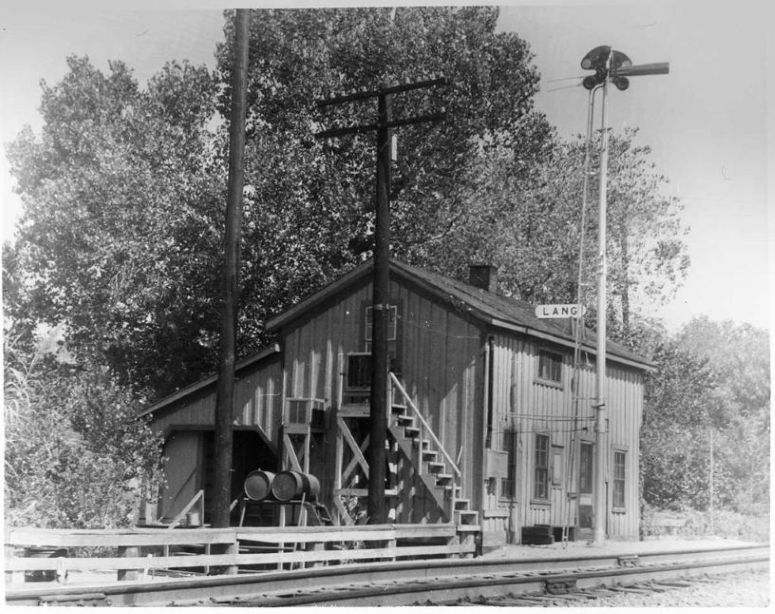 The position of the "Lang" sign can roughly date the photos. Before about 1940, there were two signs, one on each side of the station. After that, there was only one sign and it was located on the roof. Also, the stairs on the south side of the building were constructed no earlier than 1947. There was no door there, the stairs were just used to access a window air conditioner. They became affordable starting in about 1947 and popular starting in the 1950s. Another later dating device is that around 1960, there were two utility poles next to the south side of the station. The shorter one nearer the tracks had two crossbeams. The taller one had no crossbeams.
