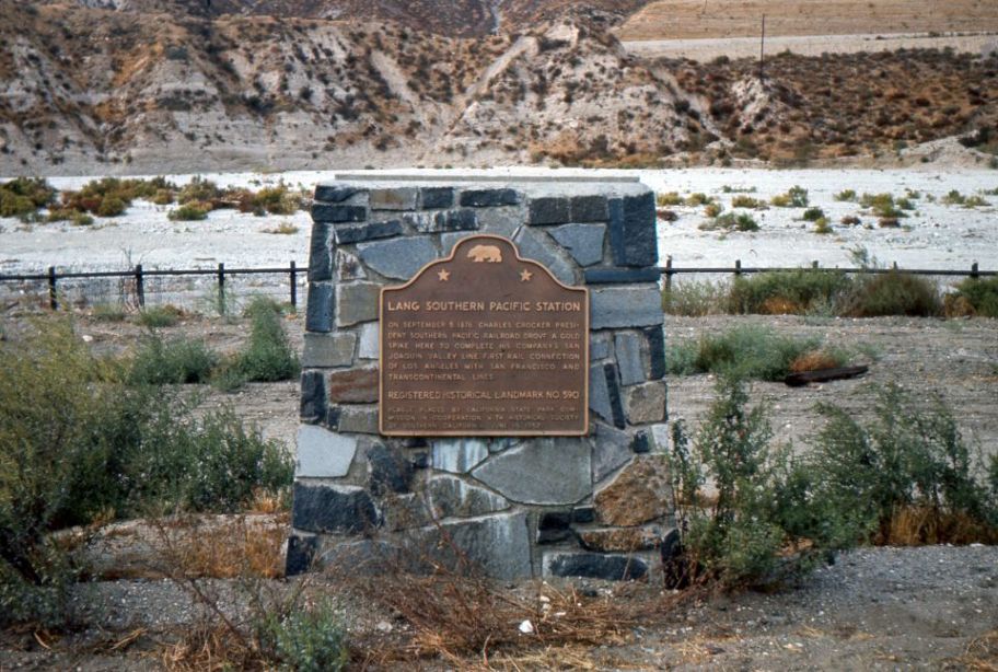 On September 5, 1876, Charles Crocker President, Southern Pacific Railroad, drove a gold spike here to complete his company's San Joaquin Valley line, first rail connection of Los Angeles with San Francisco and Transcontinental Lines.