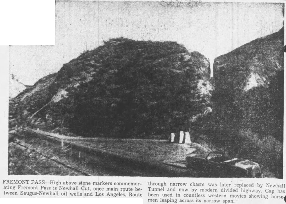 "The writer, in company with Auguste Farrier [an early rancher in Newhall] took a look over the mountains in the vicinity of the [Newhall] tunnel and the 'Fremont Pass', Tuesday. From a careful observation, and without survey, it seemed almost impossible to consider the cut known as the pass as a feasible route for a road. At least fifty feet additional depth would be required to make the grade at all passable from the south, and the north is almost as bad...And by the way the supposed Fremont Pass, is not the Fremont road at all Mr. Farrier states. He showed a path, which plainly had been a trail over the mountain, and had been at one time a wagon road. This, he says, was the real road used by Fremont, while the pass was cut for a toll road, and was so used for many years."